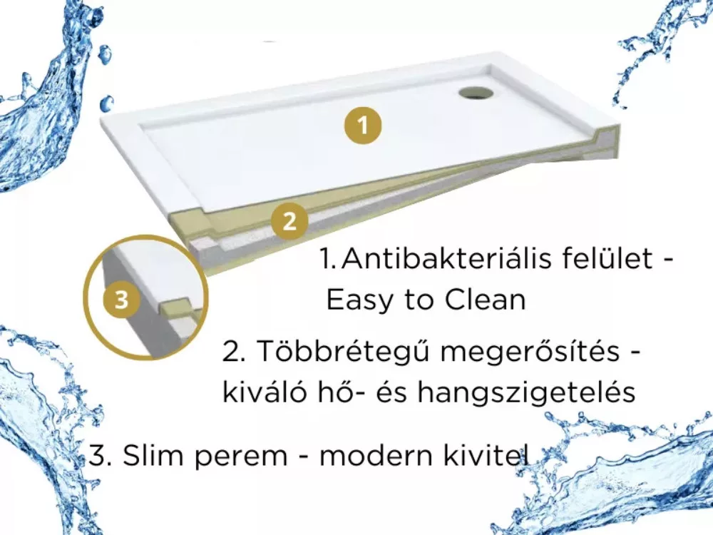 - Zuhanytálca felület: Tükörsima antibakteriális felület, amely hőtartó és csúszásmentes