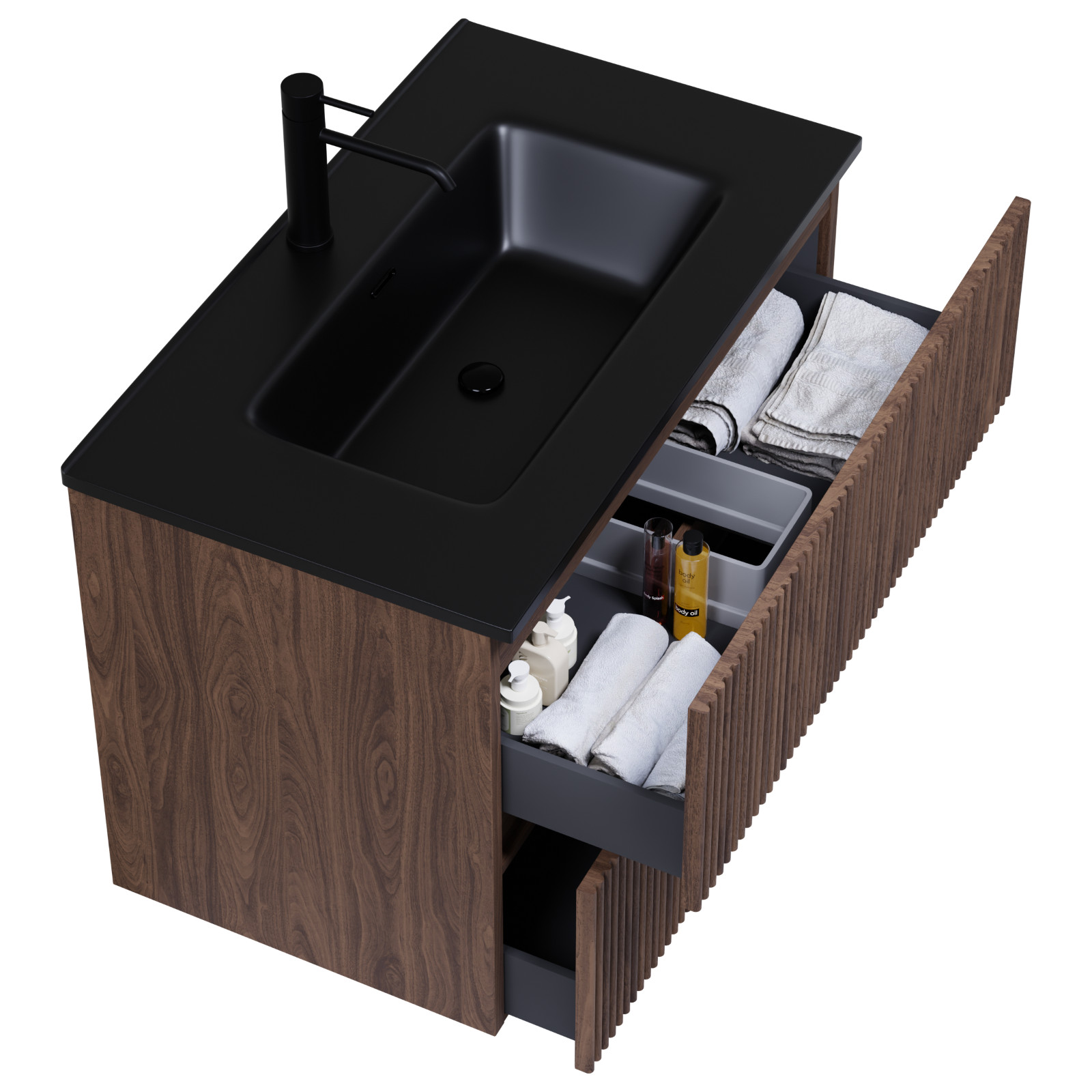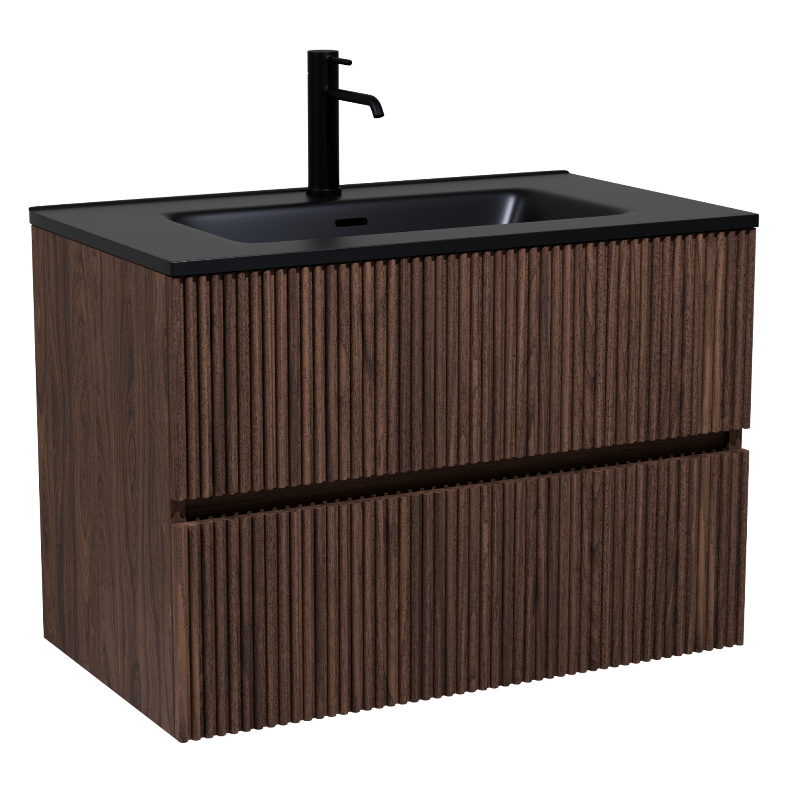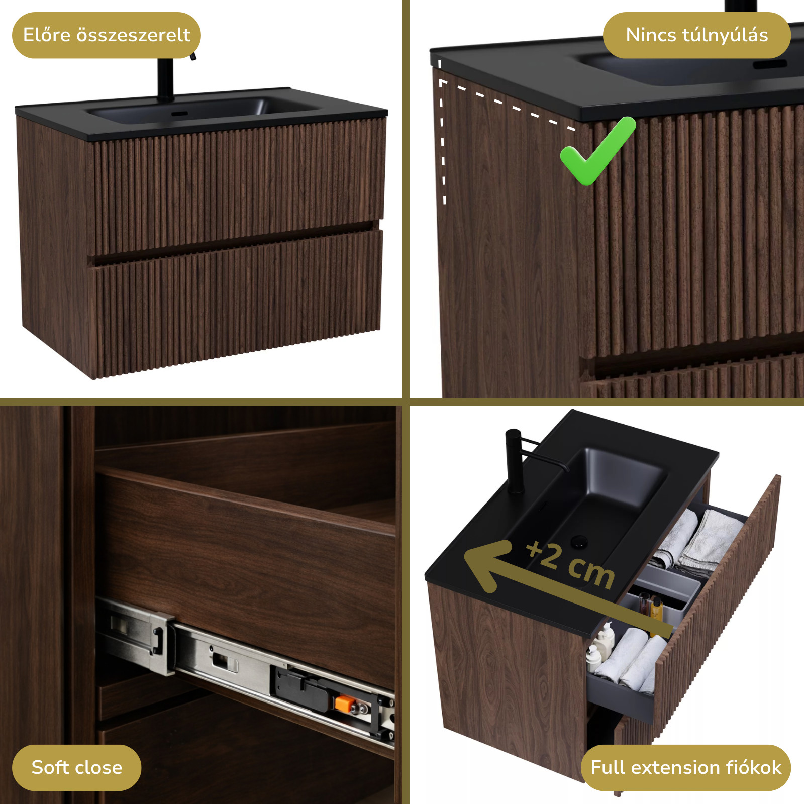 Saját márkás 60 cm széles fali mosdószekrény mogyoró színben, 3D-s fiók fronttal, matt fekete slim mosdóval, rejtett fióksínnel és önbehúzos technológiával ellátott.