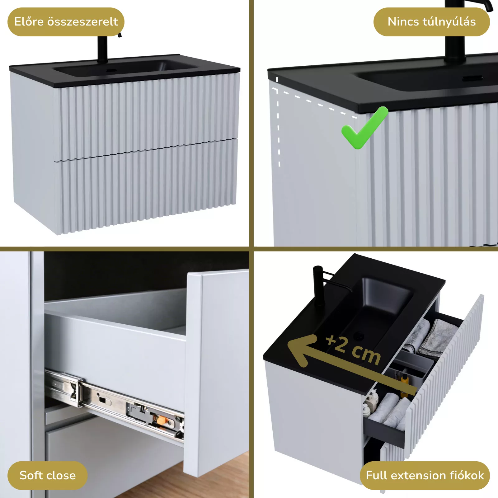 A bútort összeszerelve szállítjuk ki, így Önnek csak a mosdót és a fiók frontot kell ráhelyeznie!