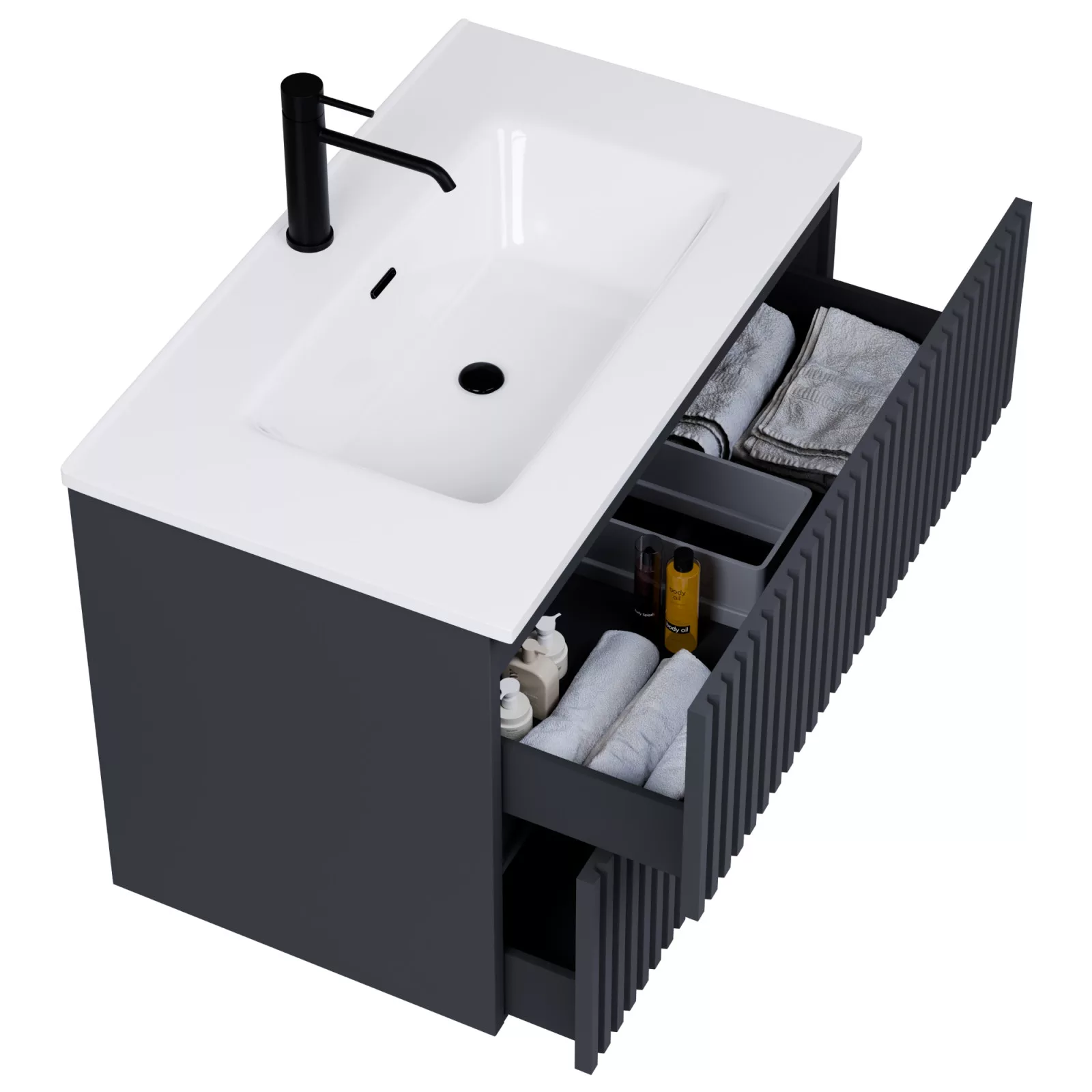 Saját márkás 60 cm széles fali mosdószekrény matt antracit színben, 3D-s fiók fronttal, fényes fehér slim mosdóval, rejtett fióksínnel és önbehúzos technológiával ellátott. A fiókok modern push-to-open mechanizmussal nyílnak, amely mechanikus rugós rendszerrel biztosítja a fogantyú nélküli nyitást.