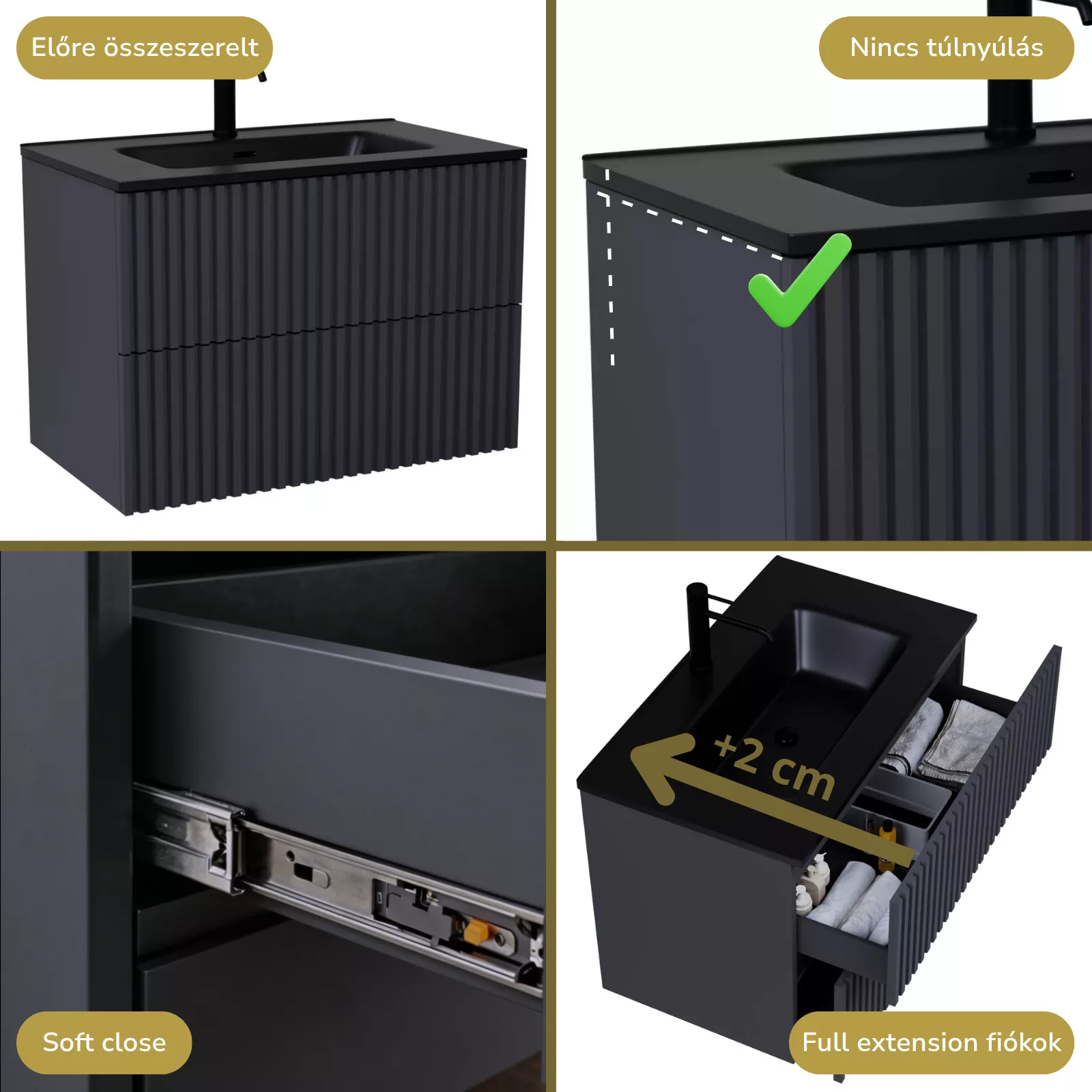 • matt antracit mosdószekrény, teljes kihúzhatóságú fiókokkal
