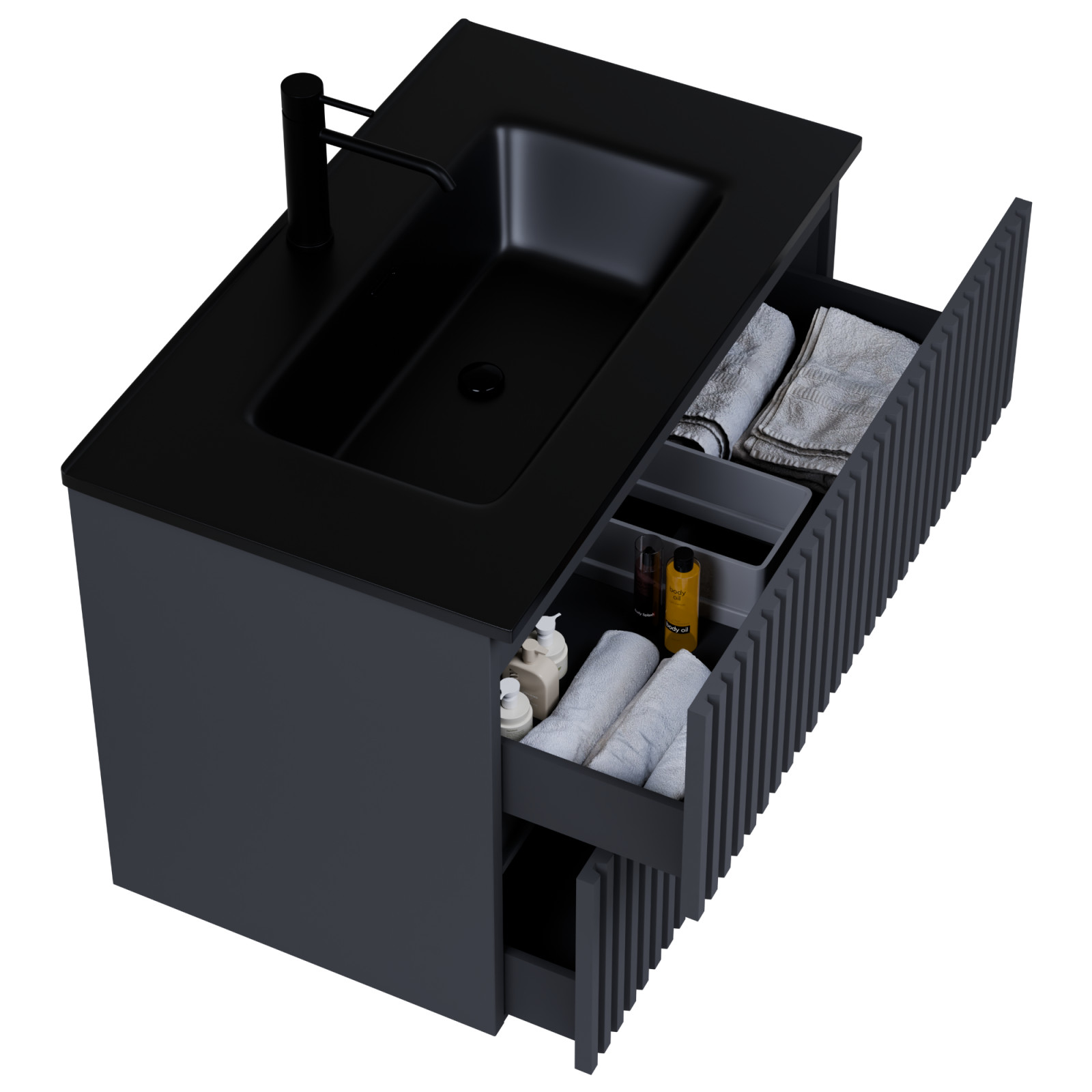 matt antracit mosdószekrény, teljes kihúzhatóságú fiókokkal
