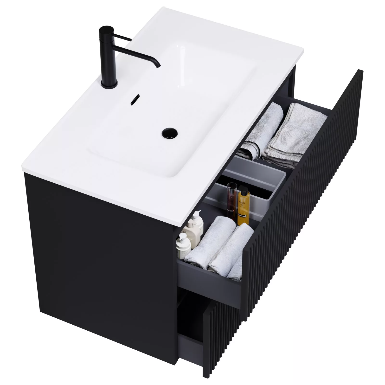 • matt fekete mosdószekrény, teljes kihúzhatóságú fiókokkal