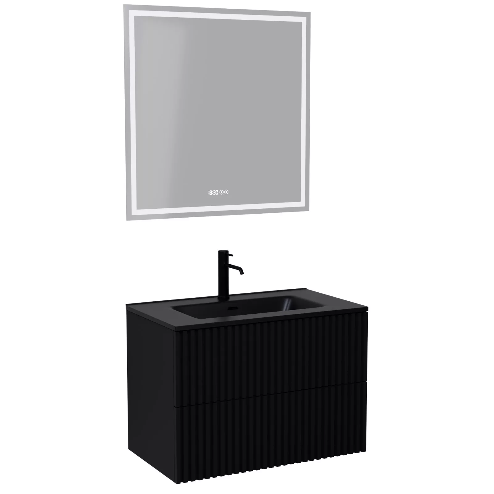 Saját márkás 60 cm széles komplett fürdőszoba bútor fali mosdószekrénnyel matt fekete színben, 3D-s fiók fronttal, fekete slim mosdóval és fali okos LED tükörrel. A fiókok modern push-to-open mechanizmussal nyílnak, amely mechanikus rugós rendszerrel biztosítja a fogantyú nélküli nyitást.