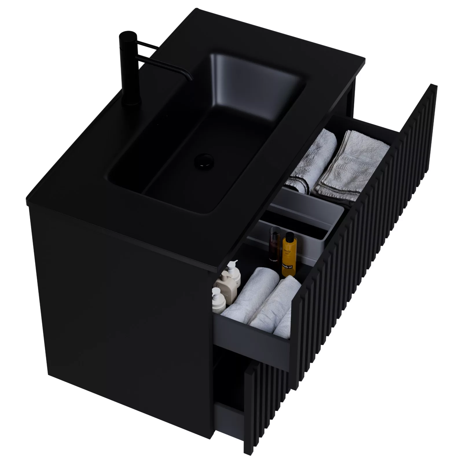 • matt fekete mosdószekrény, teljes kihúzhatóságú fiókokkal