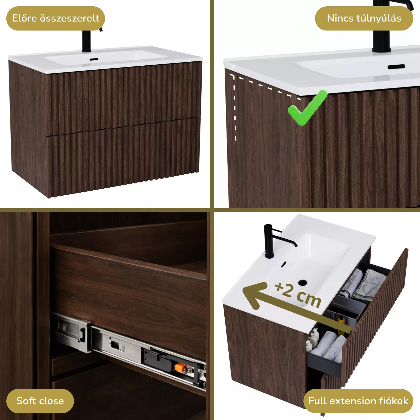 • mogyoró színű mosdószekrény, teljes kihúzhatóságú fiókokkal