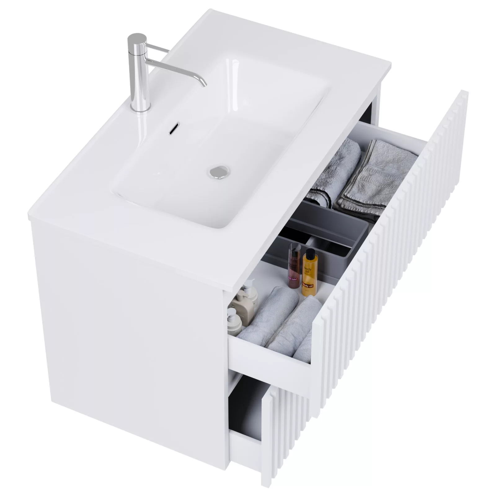 Saját márkás 60 cm széles komplett fürdőszoba bútor fali mosdószekrénnyel matt fehér színben, 3D-s fiók fronttal és fali okos LED tükörrel. A fiókok modern push-to-open mechanizmussal nyílnak, amely mechanikus rugós rendszerrel biztosítja a fogantyú nélküli nyitást.