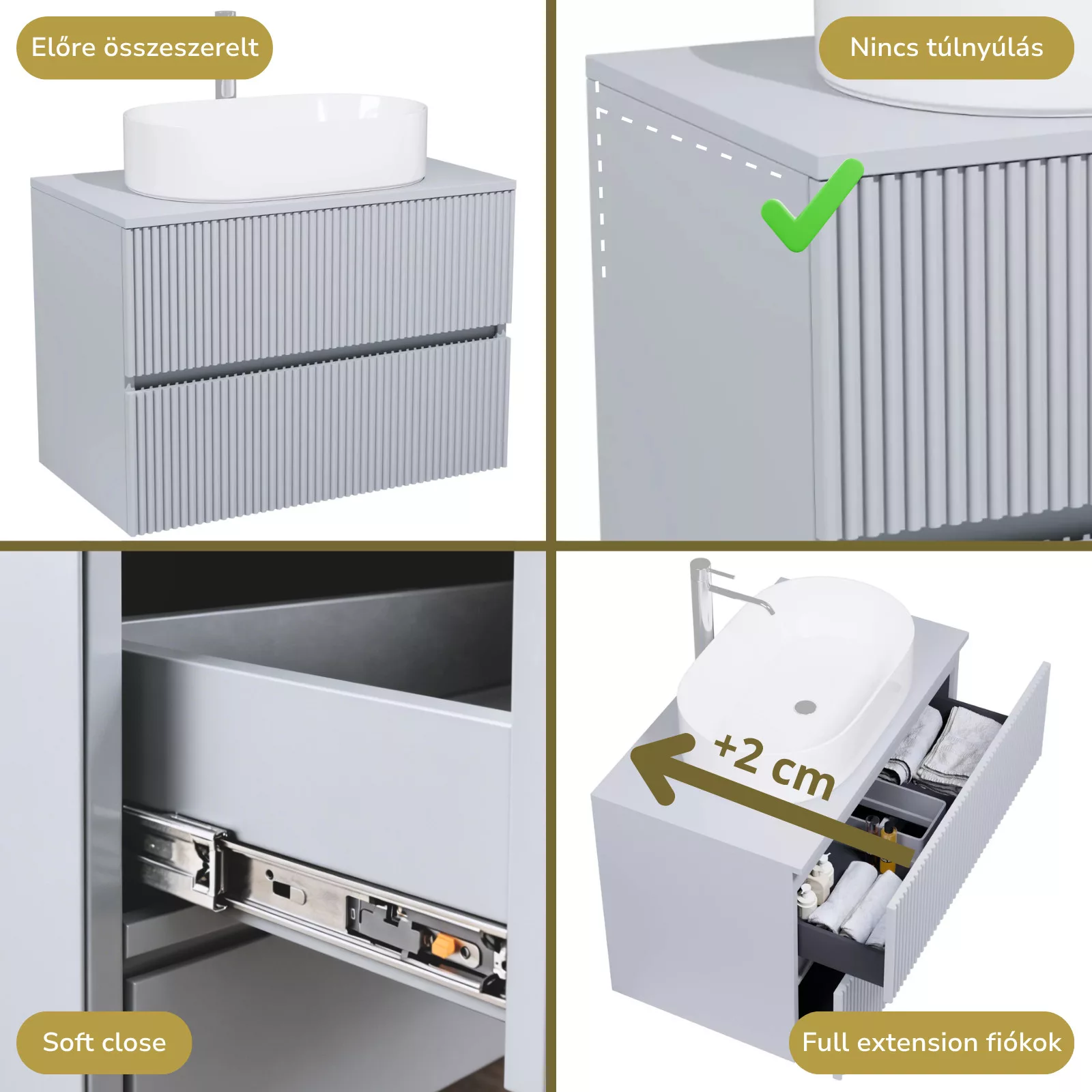 • füst szürke mosdószekrény, teljes kihúzhatóságú fiókokkal