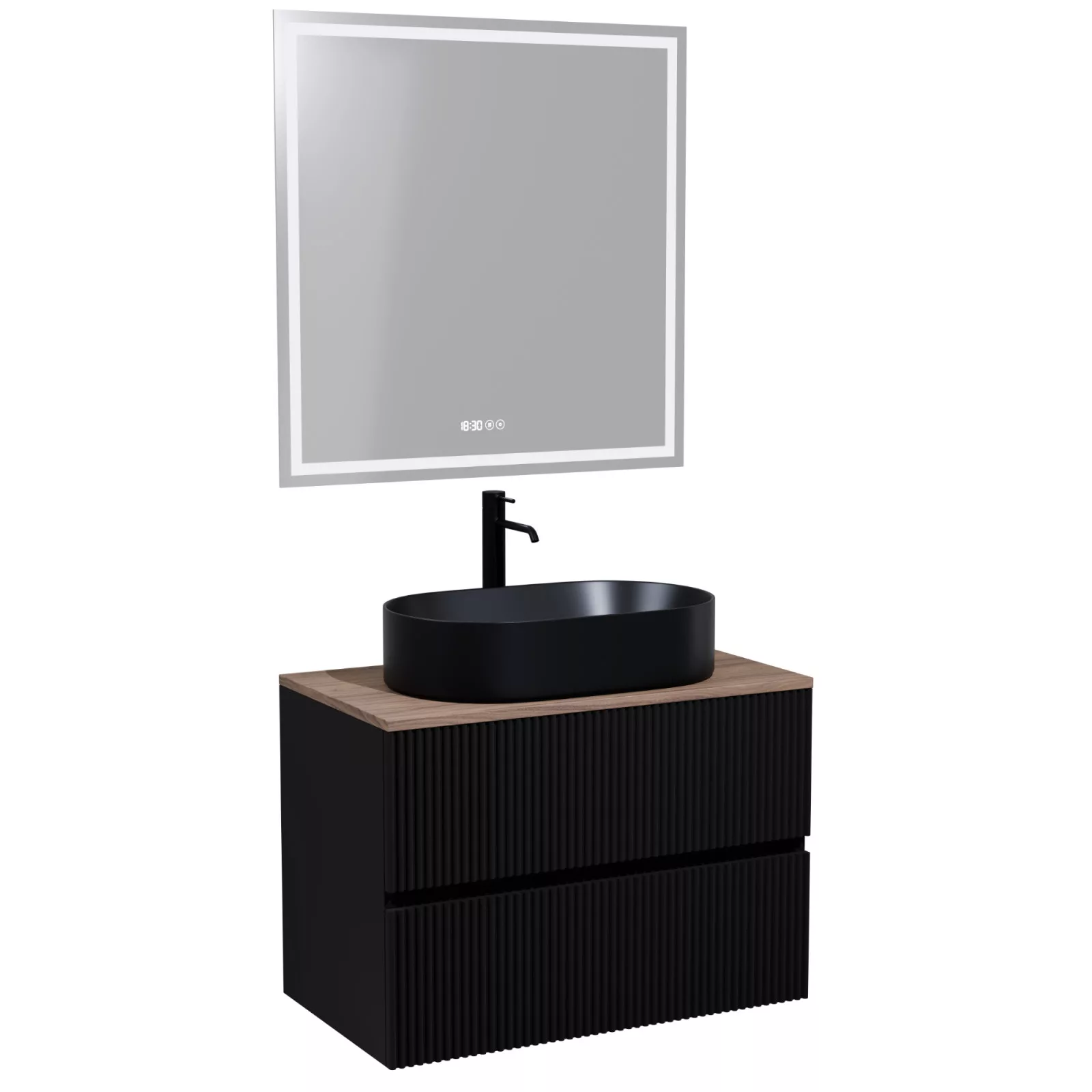 Saját márkás 60 cm széles komplett fürdőszoba bútor fali mosdószekrénnyel matt fekete színben, 3D-s színazonos fiók fronttal, tölgyfa színű mosdópulttal és fali okos LED tükörrel.