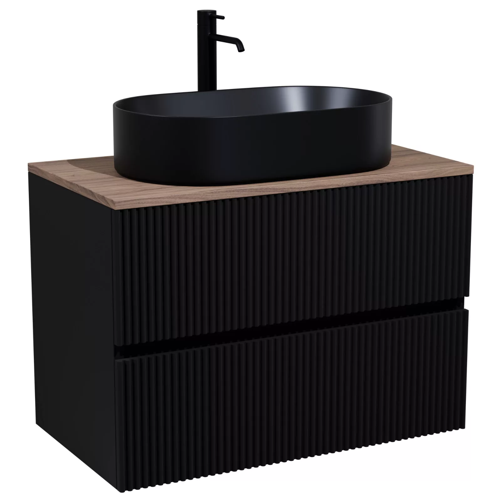 • matt fekete mosdószekrény, teljes kihúzhatóságú fiókokkal