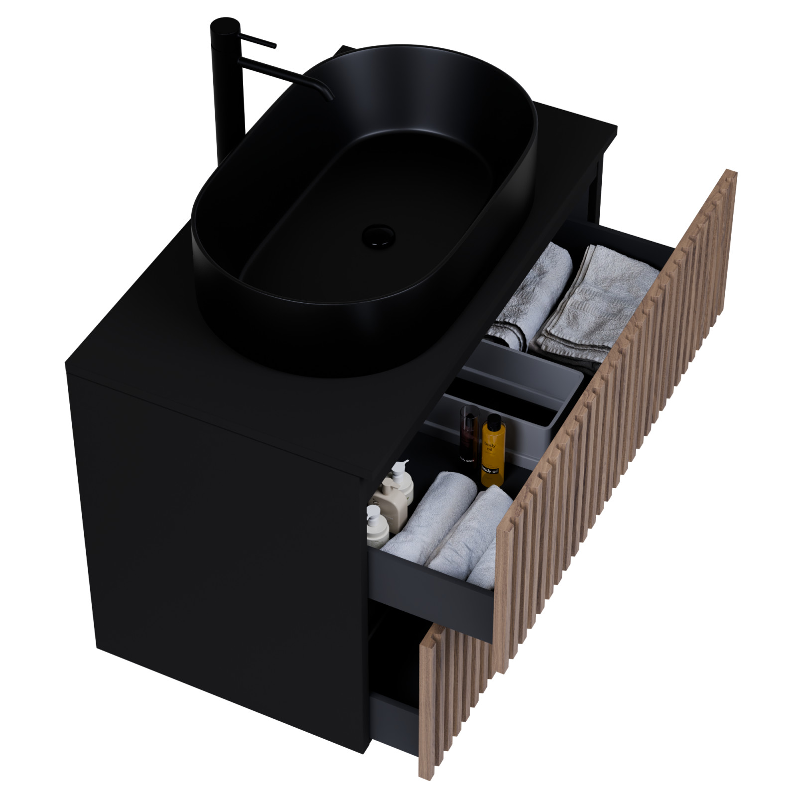 Saját márkás 60 cm széles fali mosdószekrény matt fekete színben, 3D-s tölgyfa színű fiók fronttal, matt fekete színű mosdópulttal, rejtett fióksínnel és önbehúzos technológiával ellátott. A fiókok modern push-to-open mechanizmussal nyílnak, amely mechanikus rugós rendszerrel biztosítja a fogantyú nélküli nyitást.