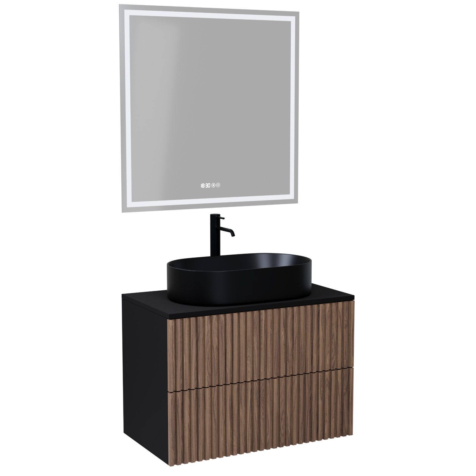 HD Rapallo Pro Black-Oak 60 komplett fürdőszoba bútor fali push-to-open mosdószekrénnyel, fekete mosdópulttal és tükörrel