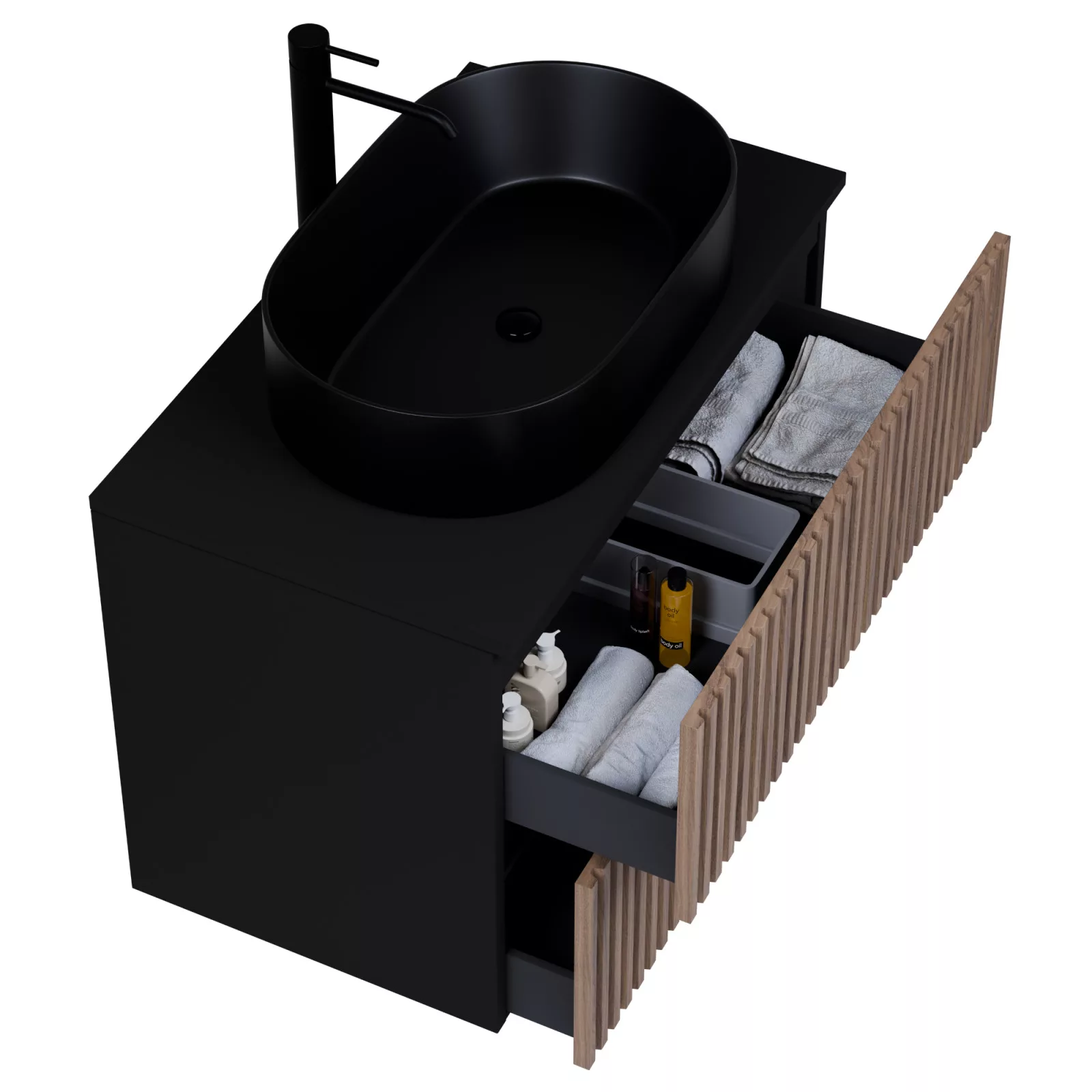 matt fekete mosdószekrény, teljes kihúzhatóságú fiókokkal