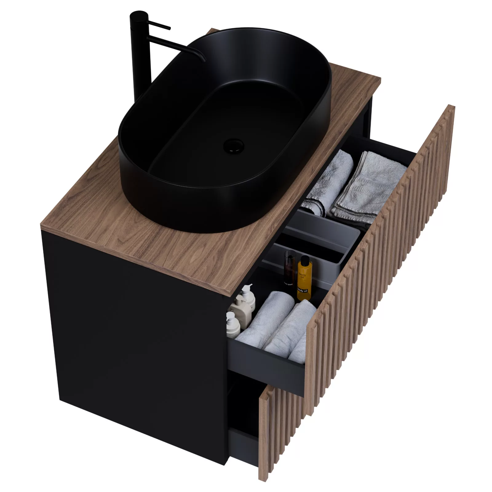 matt fekete mosdószekrény, teljes kihúzhatóságú fiókokkal