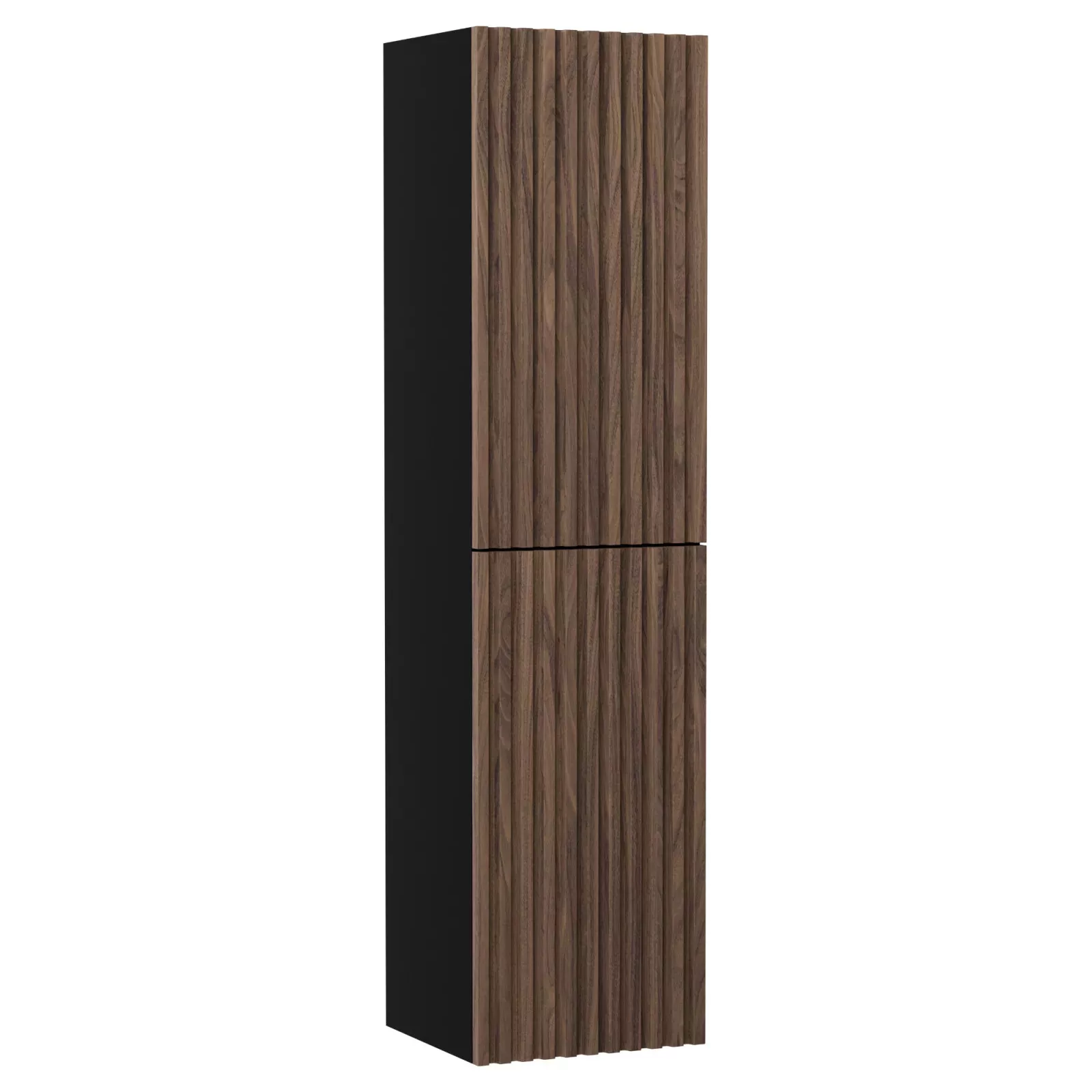 matt fekete magasszekrény, tölgyfa színű frontpanellel