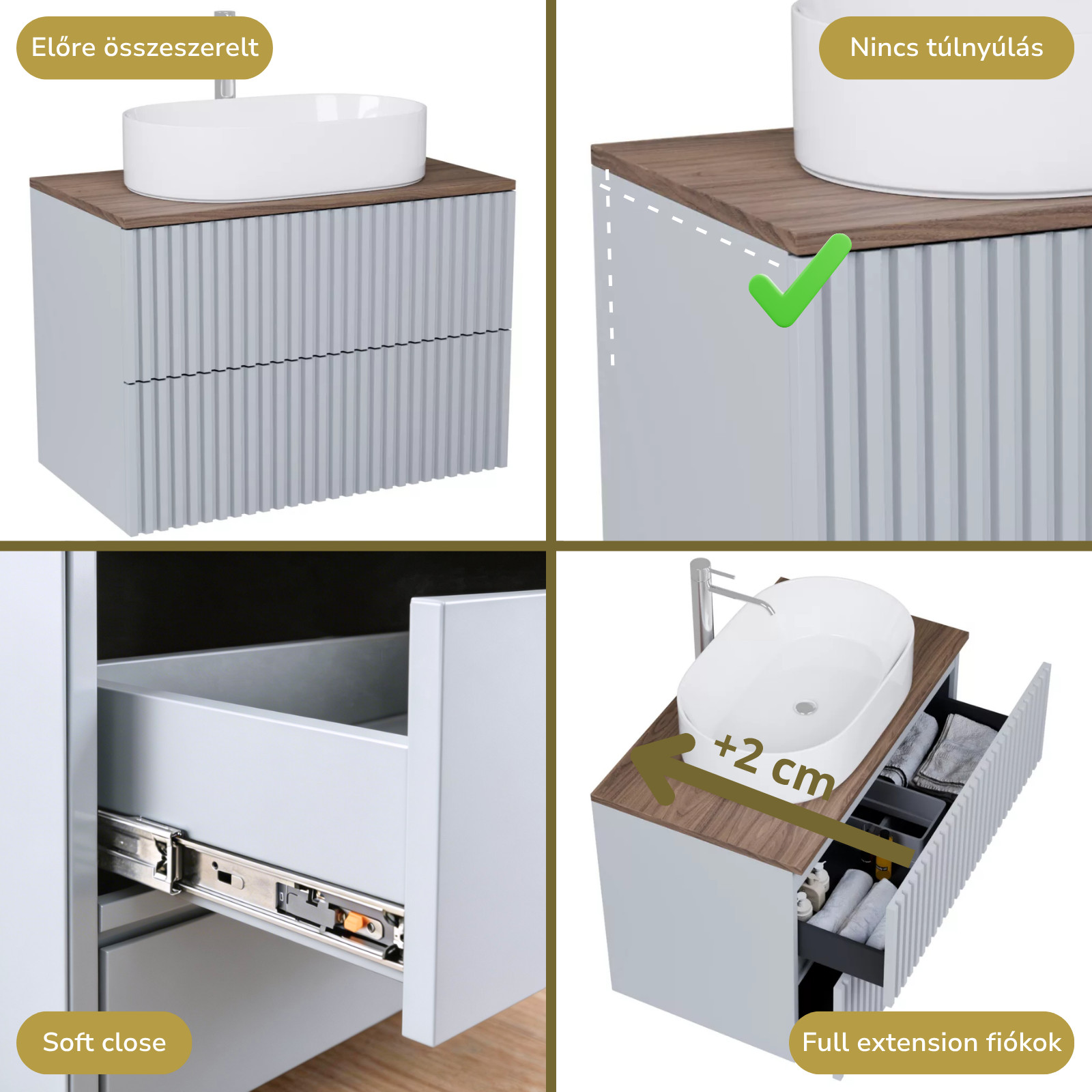 A bútort összeszerelve szállítjuk ki, így Önnek csak a mosdót és a fiók frontot kell ráhelyeznie!