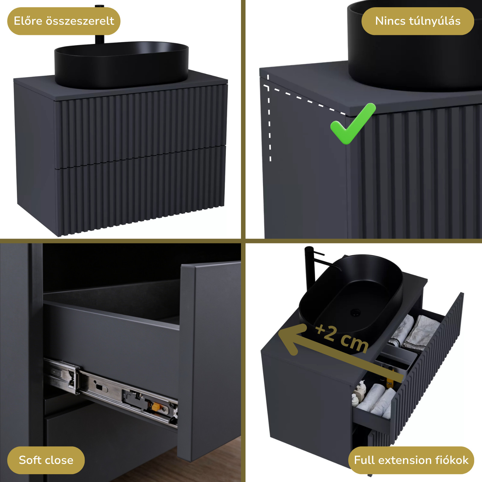 matt antracit mosdószekrény, teljes kihúzhatóságú fiókokkal