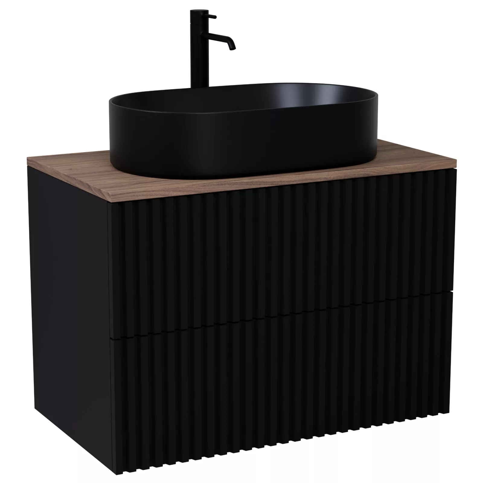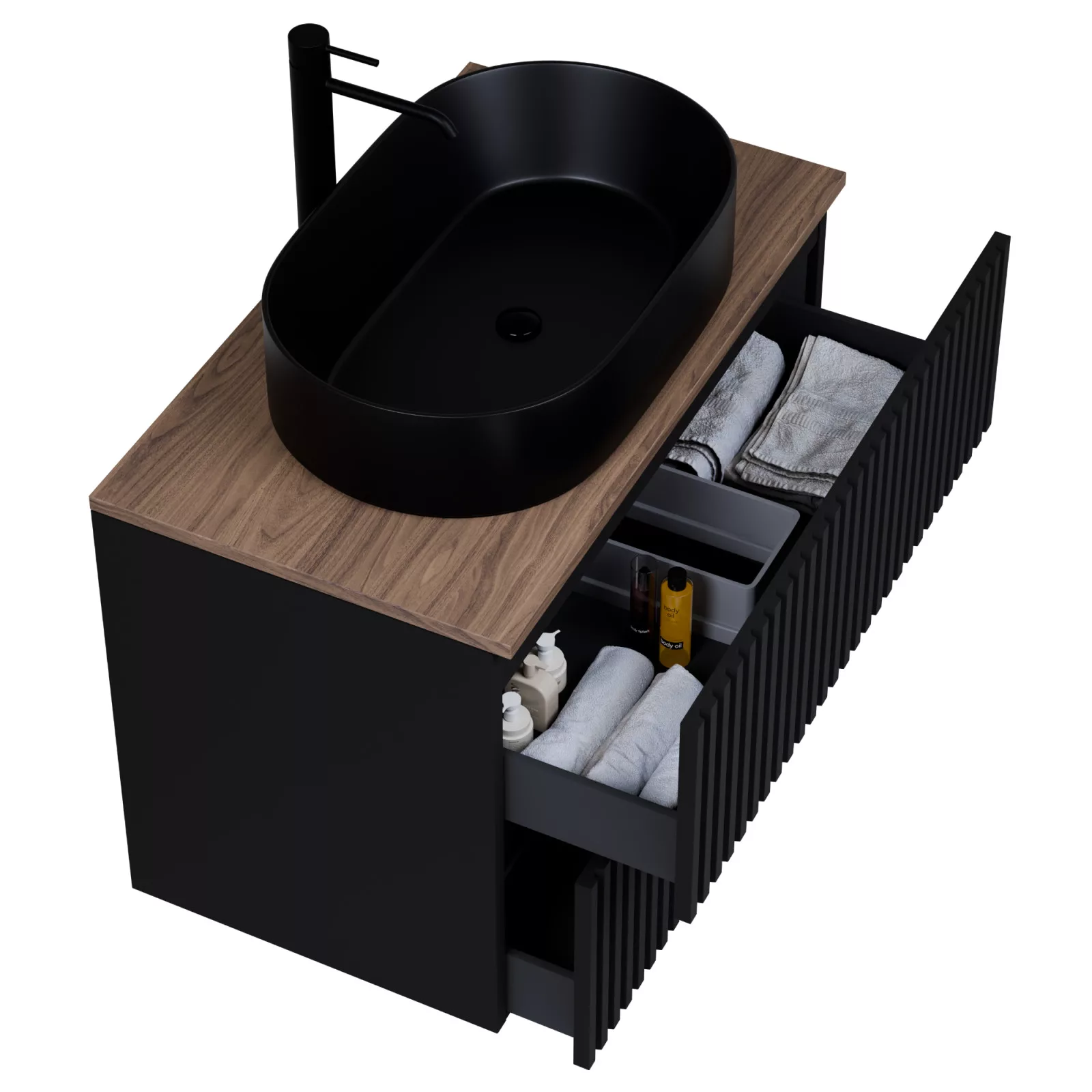 matt fekete mosdószekrény, teljes kihúzhatóságú fiókokkal