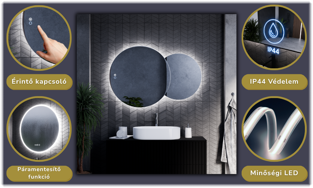 - Tükör funkciók: Ambient világítás, érintés kapcsoló, páramentesítő fűtés