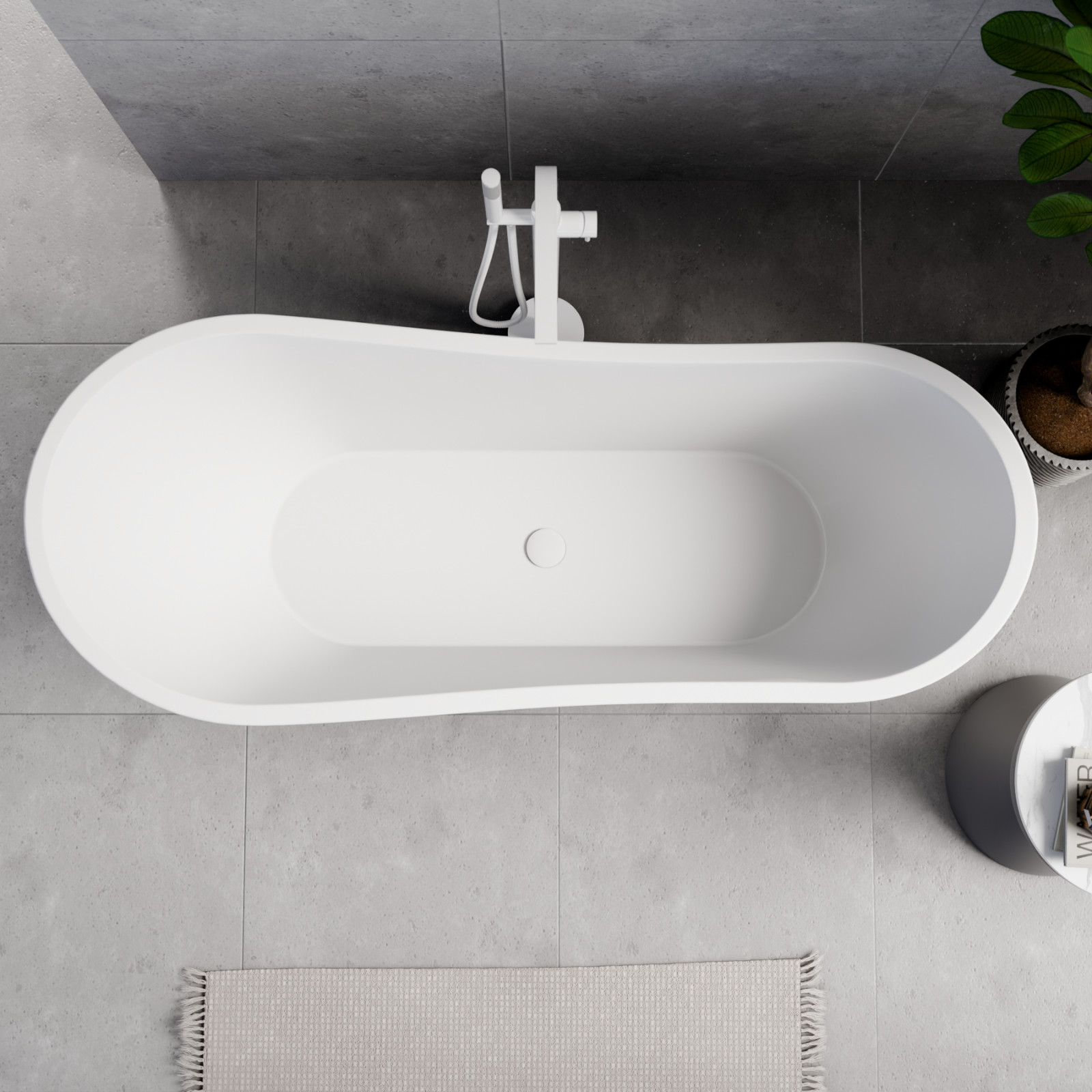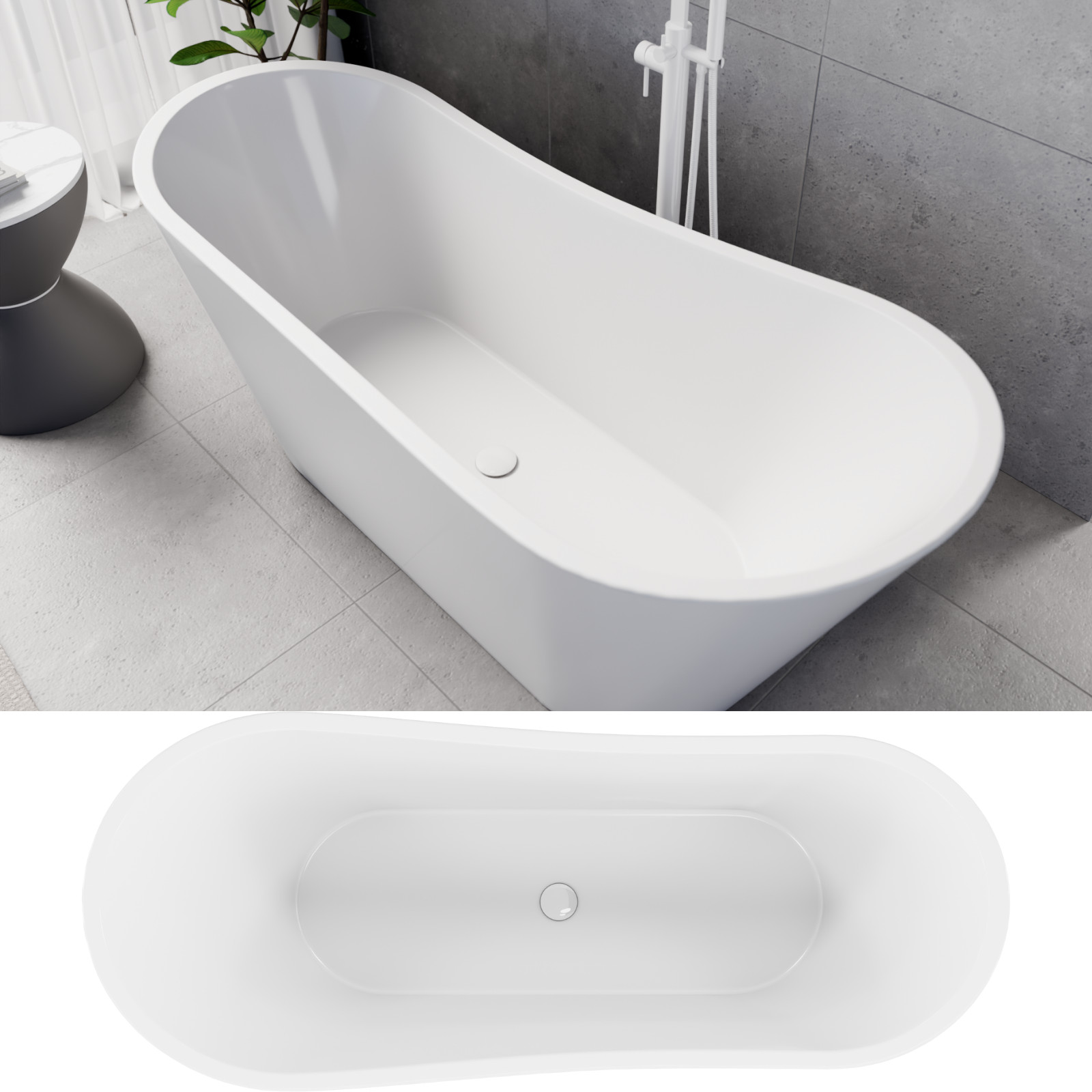 Ovális formájú térben álló hófehér akril kád fehér burkolattal, túlfolyó nélkül és fényes fehér click-clack leeresztővel, amely tágas, kényelmes, finoman kidolgozott és rendkívül elegáns megjelenésű.