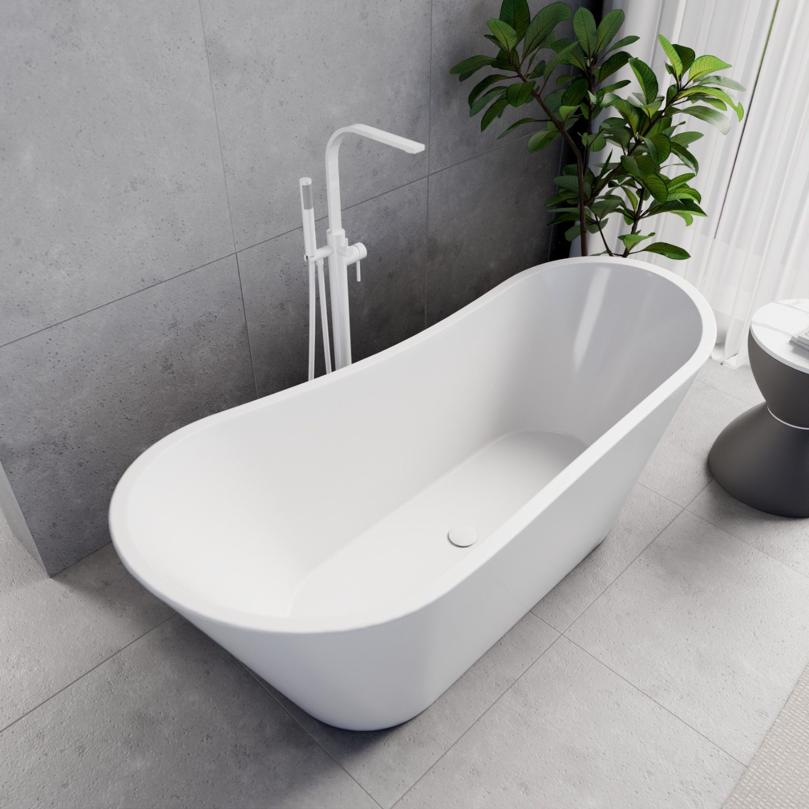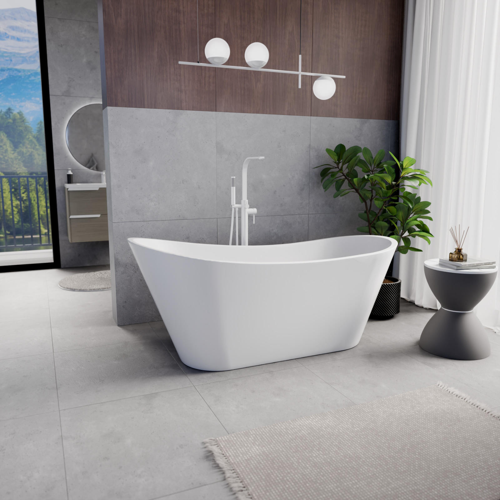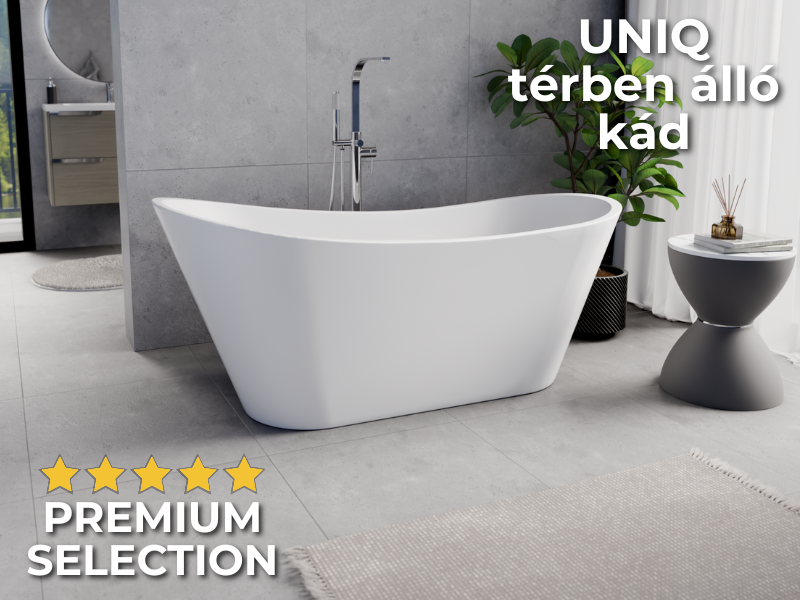 Uniq White térben álló akril kád, 170 cm hosszú, matt fehér elemekkel
