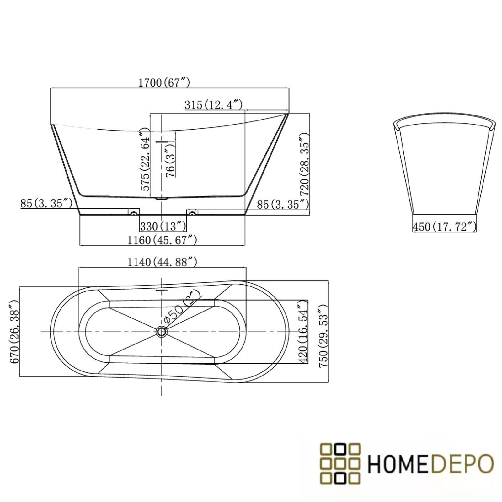 HD Uniq White szögletes térben álló akril kád fényes fehér click-clack leeresztővel, 170x72x70 cm