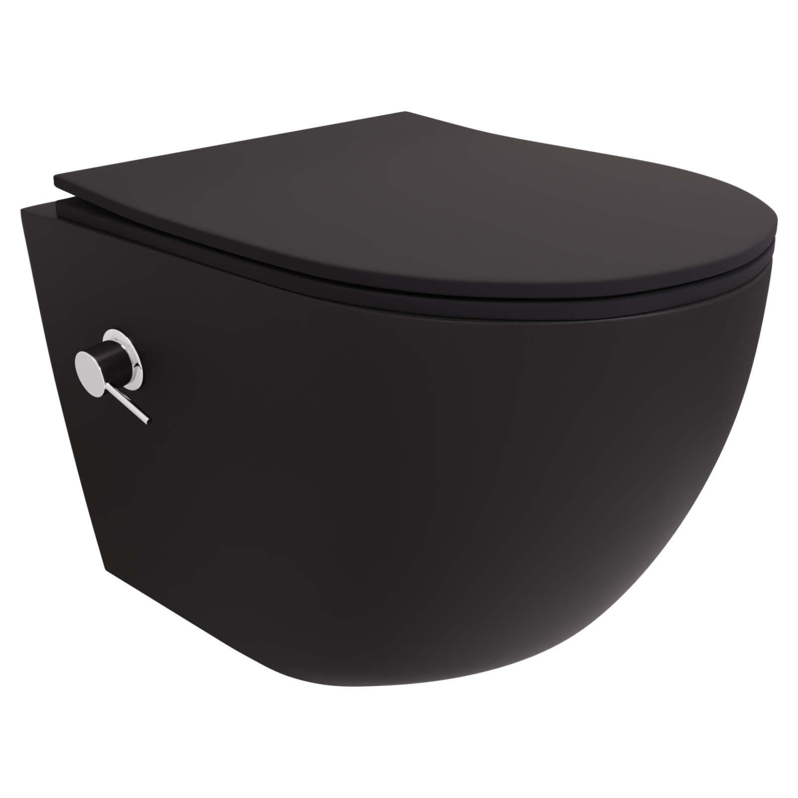 HD Vario Matt Black perem nélküli mély öblítésű íves fali WC, krómozott bidé funkcióval, slim "P" tetővel és matt fekete zsanérral