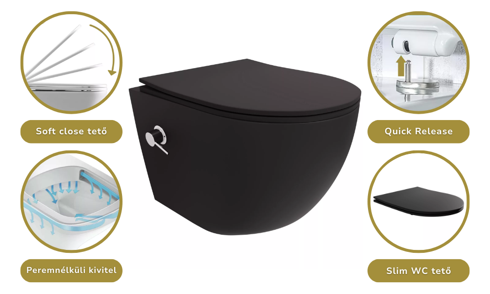 • Tartozékok: Felfogató csomag, slim WC tető, bidé funkció szett
