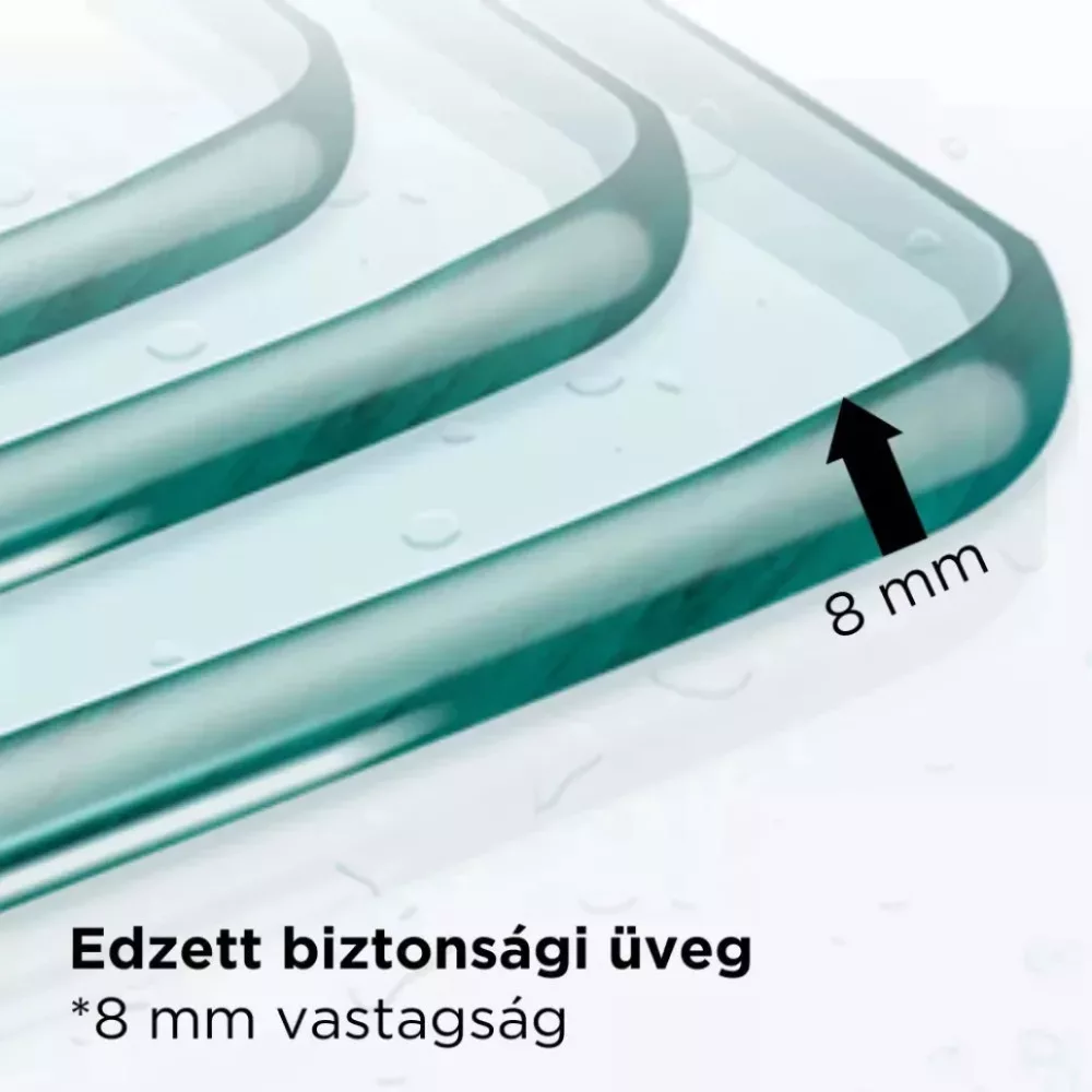 A 8 mm vastag biztonsági edzett üveg olyan speciális hőkezelésen esett át, melynek köszönhetően jobban ellenáll bármilyen külső hatásnak, ezzel minimálisra csökkentve az üvegtörés esélyét.