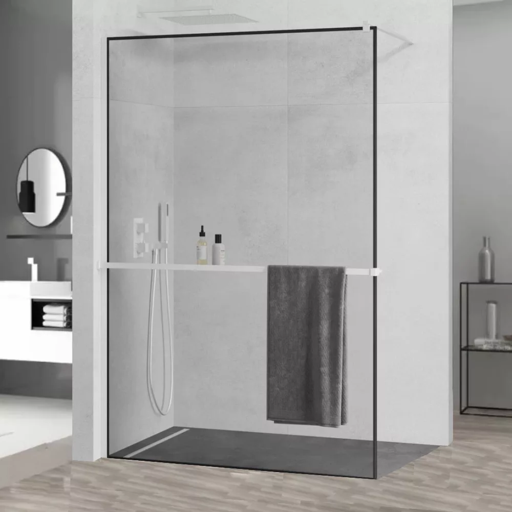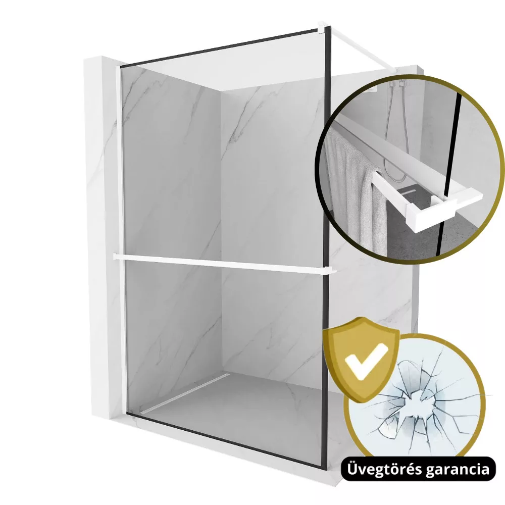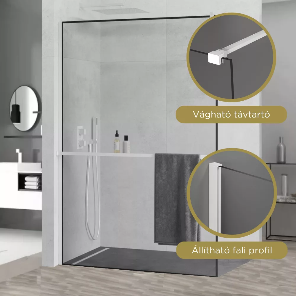 A mai modern stílusnak megfelelően alkottuk meg a visszafogott, mégis szemet gyönyörködtető Walk-In zuhanyfalunkat. Helyet kaphat bármilyen stílusú fürdőszobában, képes a belső összképhez hozzájárulni. A fehér színű profilok, a távtartó és a tusfürdő tartó polc remek színárnyalatban készülnek el, ami a különböző megvilágítások alatt is kellemes érzetet keltenek. A polc egyaránt alkalmas a tusfürdő tárolására és a törölköző tárolására, így biztosítva még nagyobb kényelmet a használat során!