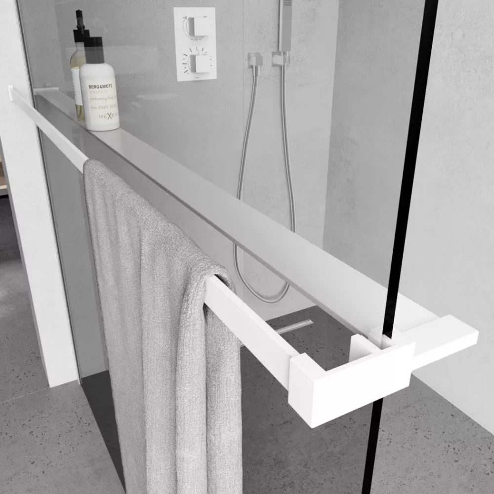 Az alumínium polc és törölközőtartó egy modern kiegészítő eleme a Walk-In zuhanyfalnak, amelyen nem csak designban hanem funkcionalitásában is kiemelkedő szereppel rendelkezik. A belső oldalon lehetősége elhelyezni a nap mint nap használt tusfürdőket, míg kivülről lehetőség adódik a törölközők szárítására és tárolására.