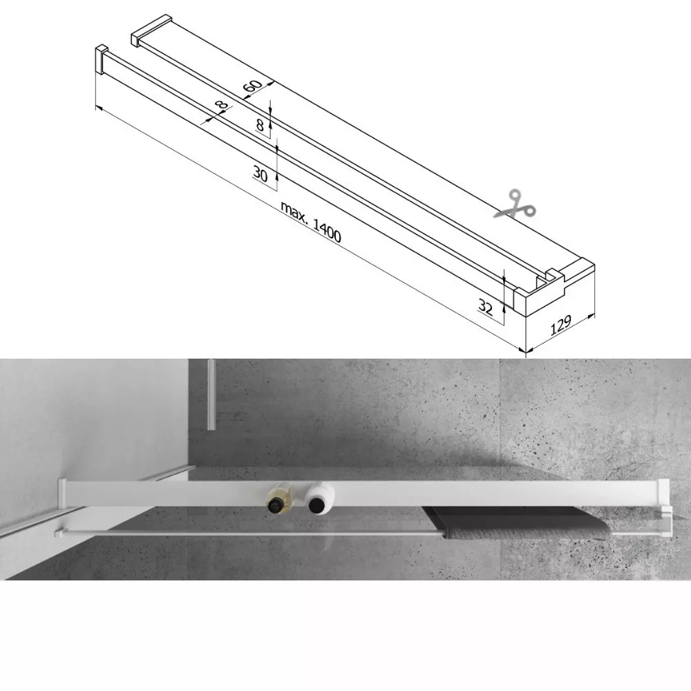 - Felszereltség: Fehér állítható alumínium profil, 50-150 cm között vágható rozsdamentes acél távtartó és Fehér színű alumínium polc és törölközőtartó