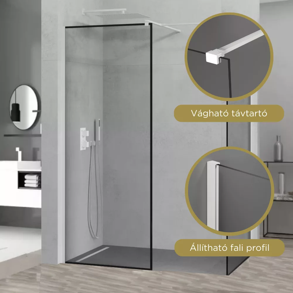 A mai modern stílusnak megfelelően alkottuk meg a visszafogott, mégis szemet gyönyörködtető Walk-In zuhanyfalunkat. Helyet kaphat bármilyen stílusú fürdőszobában, képes a belső összképhez hozzájárulni. A fehér színű profilok és távtartó remek színárnyalatban készülnek el, ami a különböző megvilágítások alatt is kellemes érzetet keltenek.