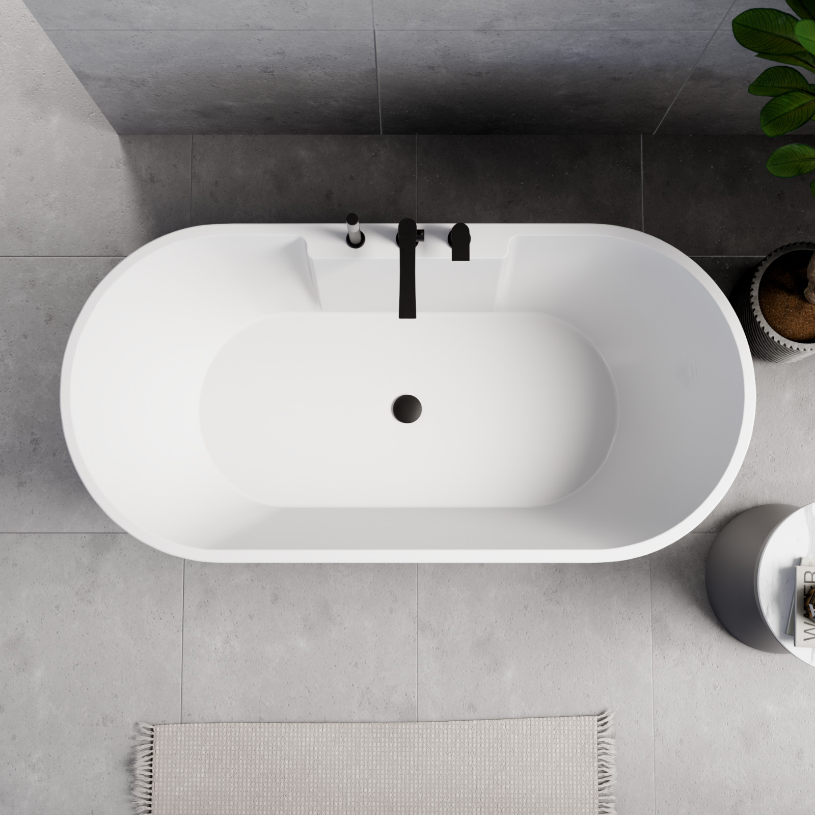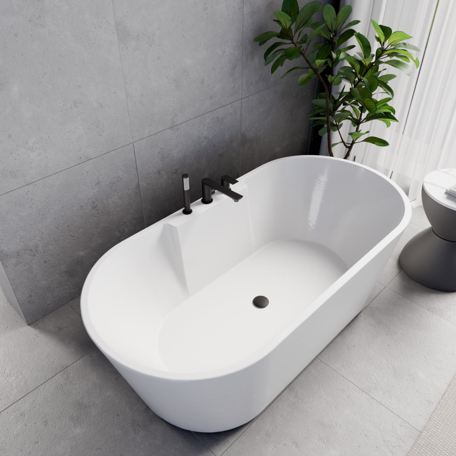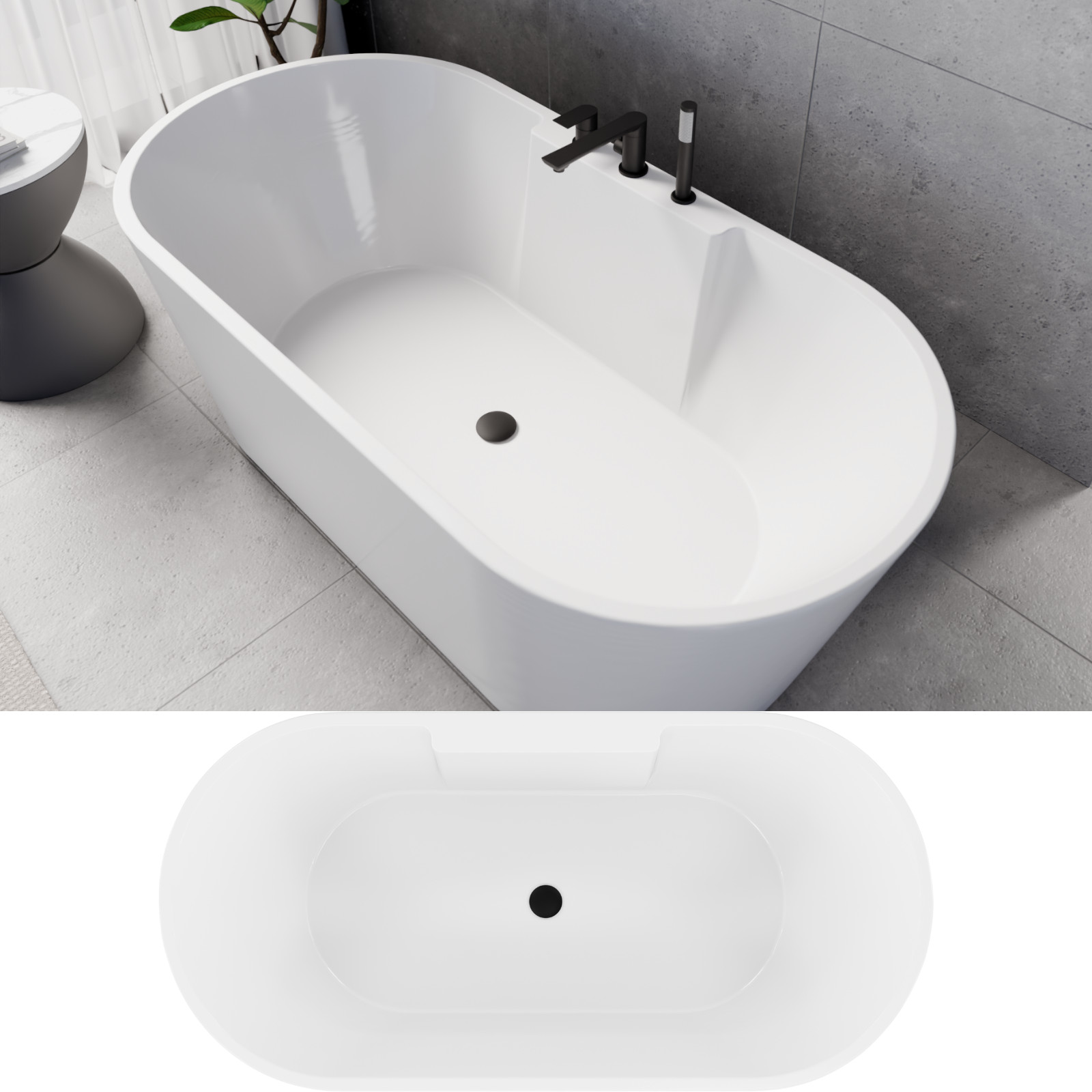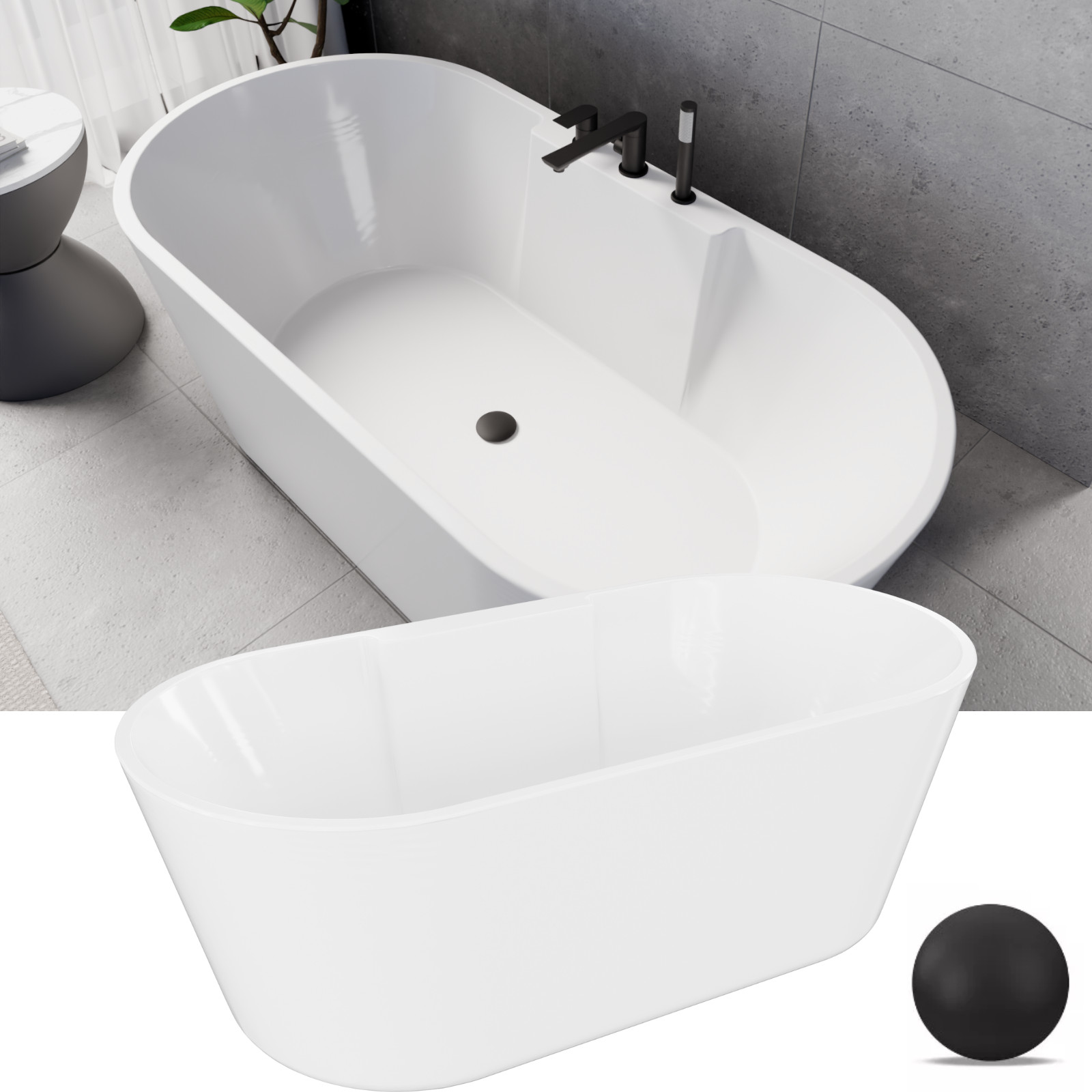 Vision ovális térben álló akril kád, 160 cm hosszú, matt fekete elemekkel