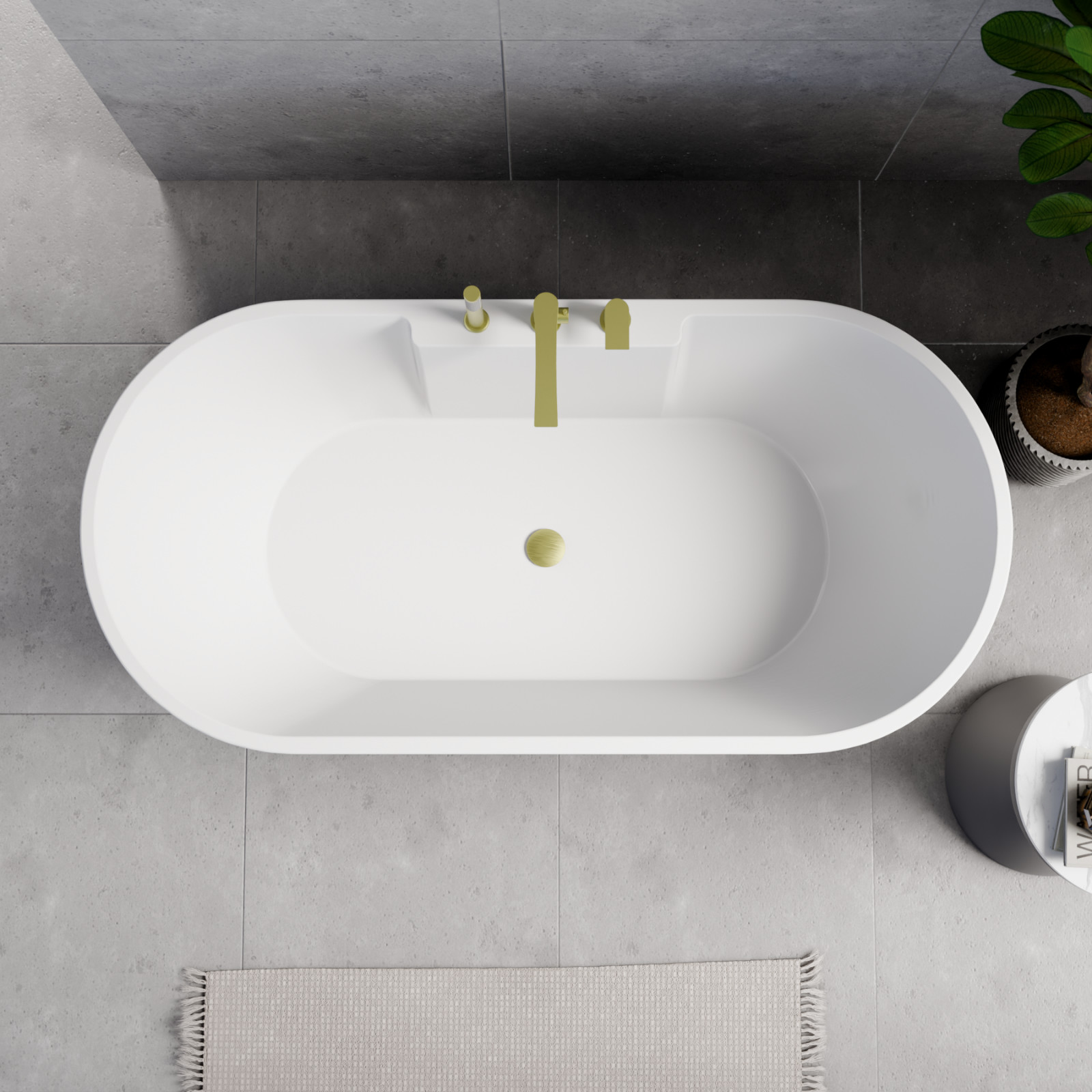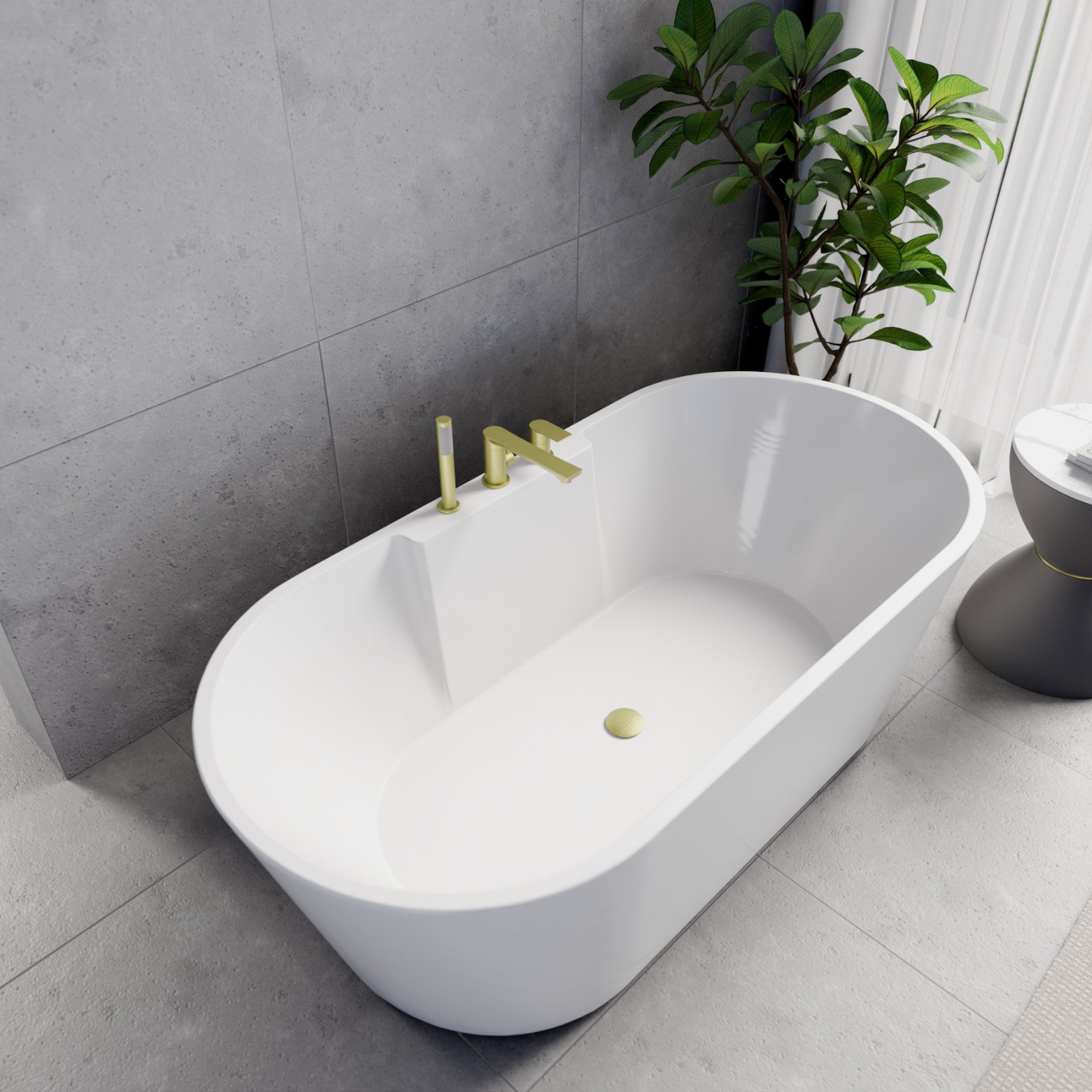 Vision ovális térben álló akril kád, 160 cm hosszú, szálcsiszolt arany elemekkel