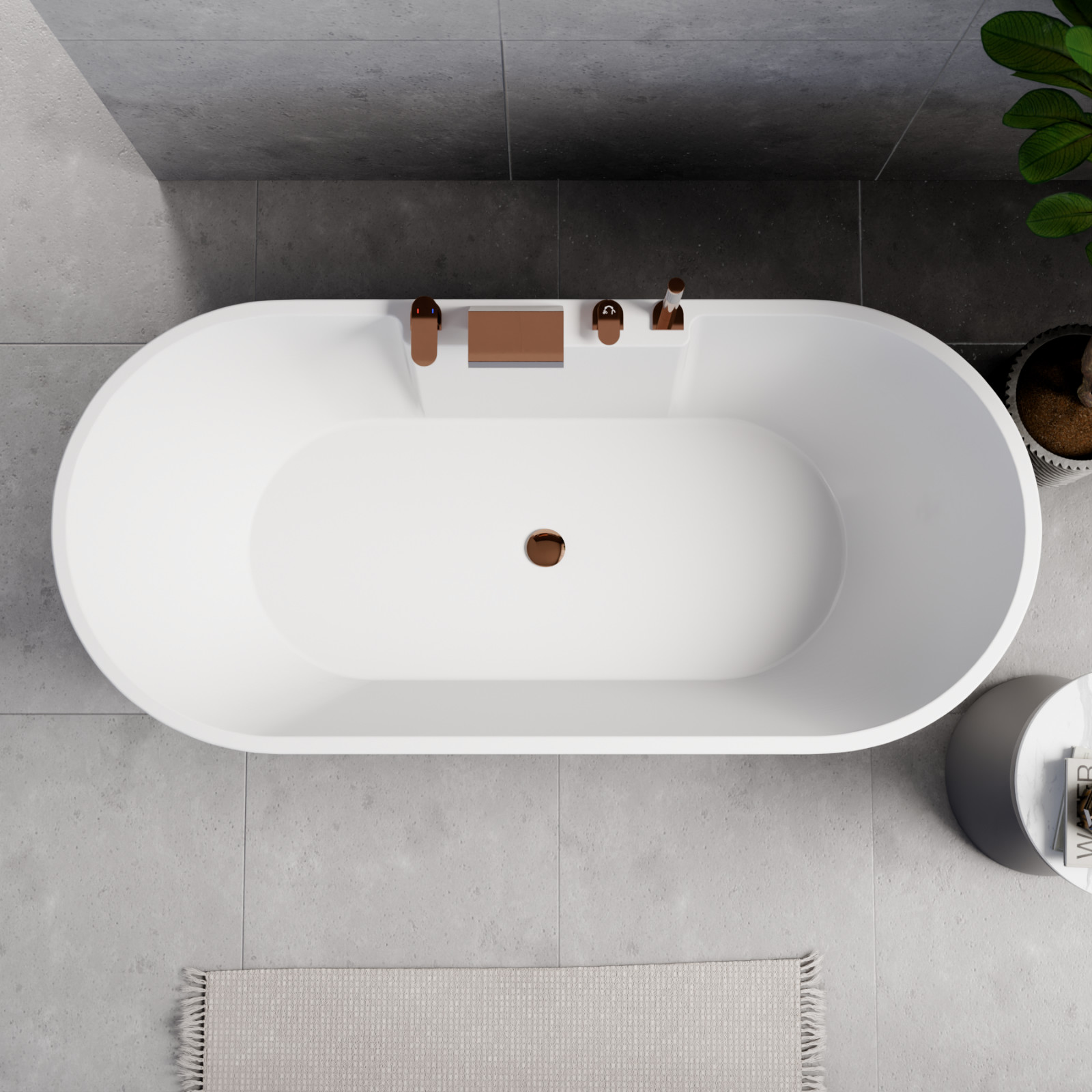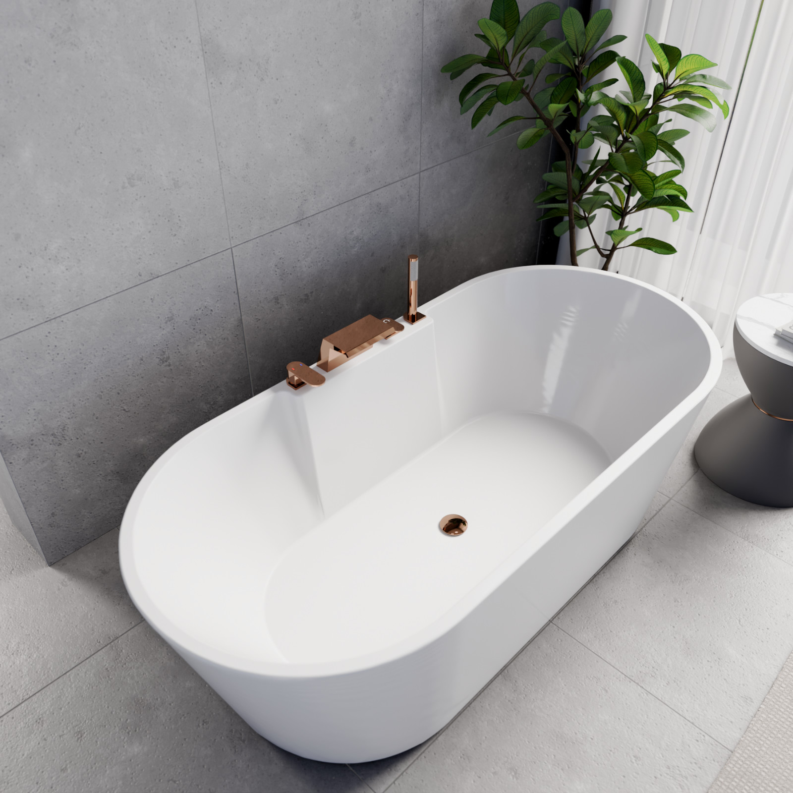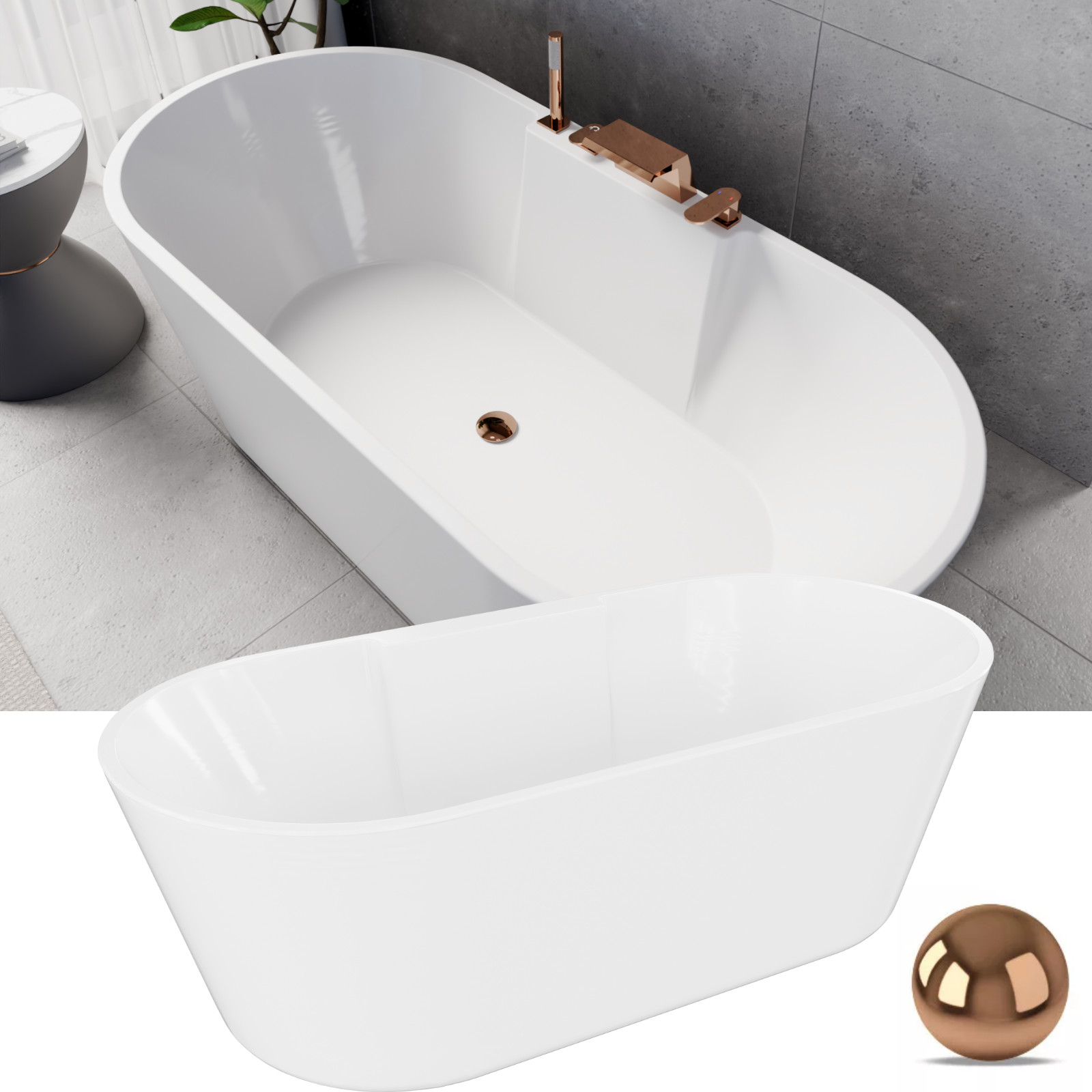 Vision ovális térben álló akril kád, 170 cm hosszú, rózsa arany elemekkel