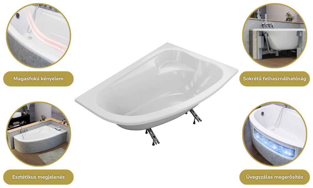 A fürdőkádjaink sokrétű módon felhasználhatóak: burkolható, lábra szerelhető, valamint padlóba süllyeszthető. A fürdőkádhoz tartozó elő és/vagy oldallap könnyedén felhelyezhető.