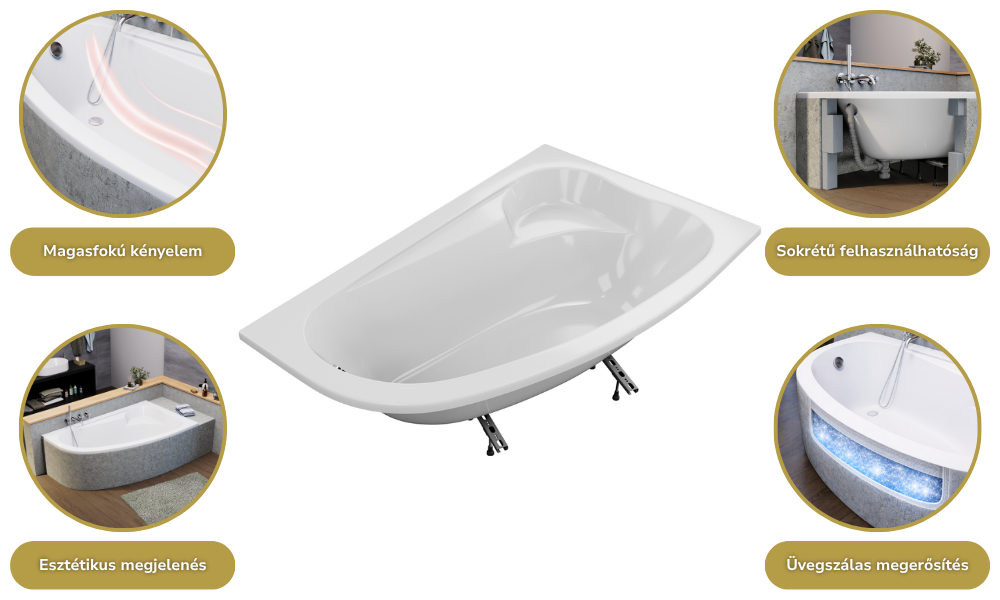 A fürdőkádjaink sokrétű módon felhasználhatóak: burkolható, lábra szerelhető, valamint padlóba süllyeszthető. A fürdőkádhoz tartozó elő és/vagy oldallap könnyedén felhelyezhető.