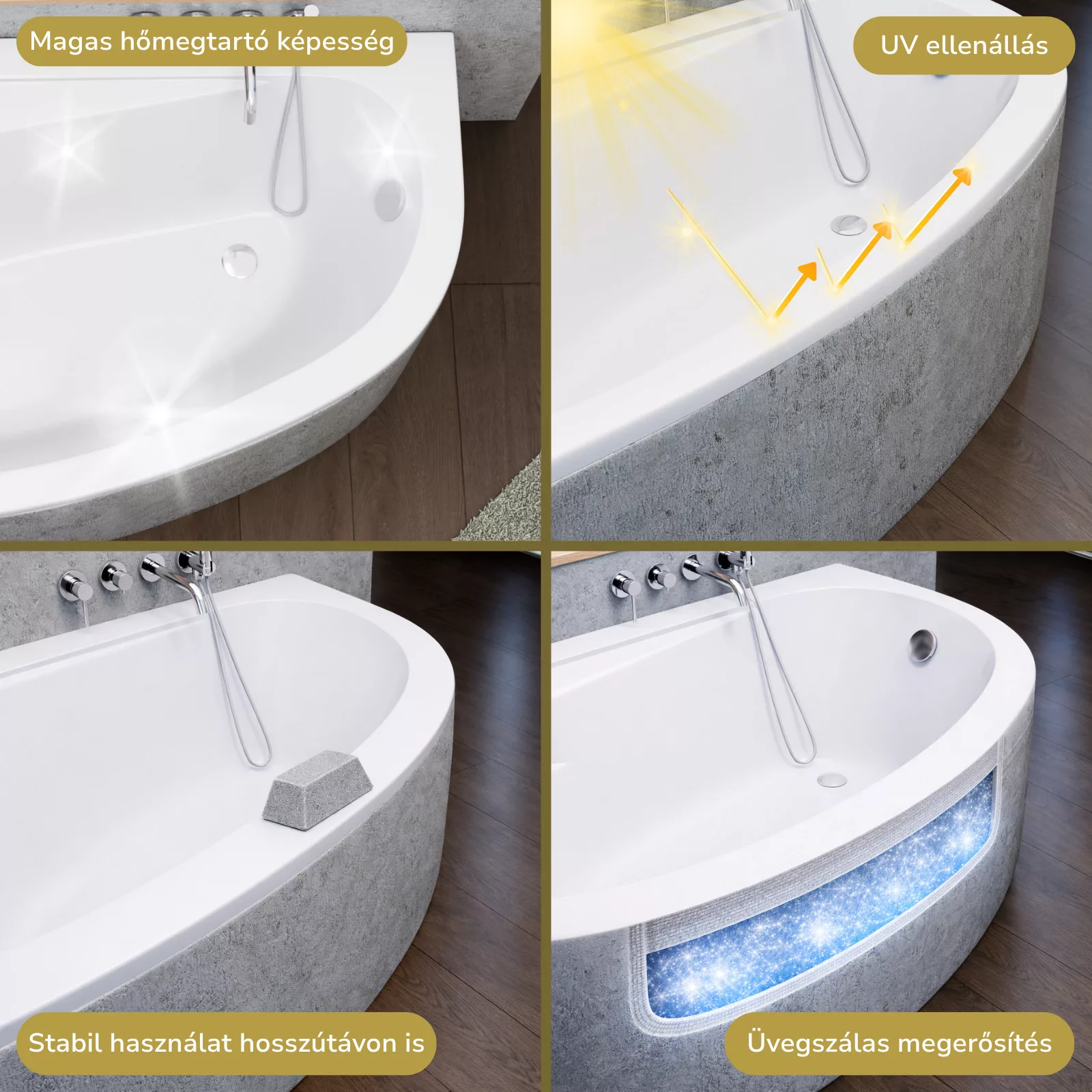 A fürdőkád ellenáll az UV sugárzásnak (nap, fénycsövek, LED izzók) és nem bocsát ki kémiai vegyületeket, ami bőrbaráttá teszi és biztosítja, hogy nem fakul ki a hosszú évek során.