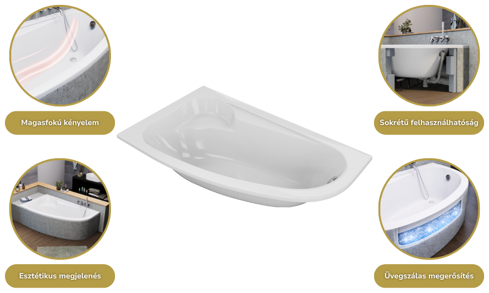 A fürdőkádjaink sokrétű módon felhasználhatóak: burkolható, lábra szerelhető, valamint padlóba süllyeszthető. A fürdőkádhoz tartozó elő és/vagy oldallap könnyedén felhelyezhető.
