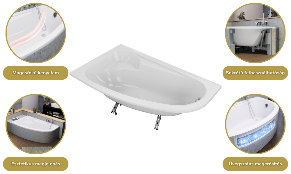 A fürdőkádjaink sokrétű módon felhasználhatóak: burkolható, lábra szerelhető, valamint padlóba süllyeszthető. A fürdőkádhoz tartozó elő és/vagy oldallap könnyedén felhelyezhető.