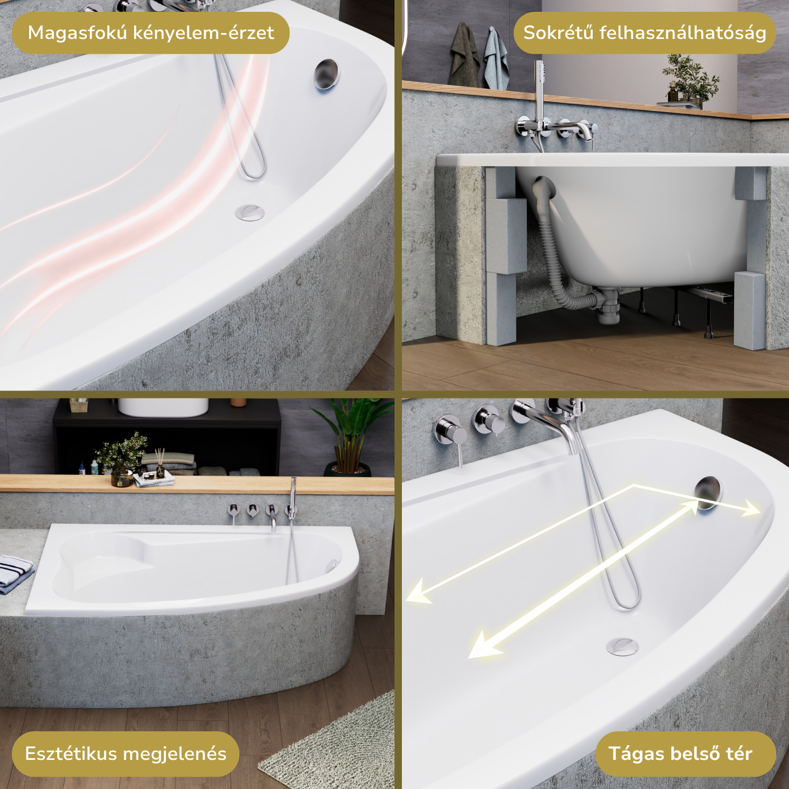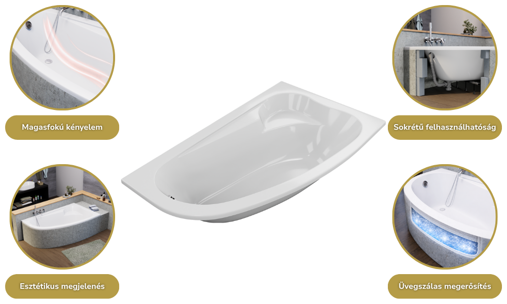 A fürdőkádjaink sokrétű módon felhasználhatóak: burkolható, lábra szerelhető, valamint padlóba süllyeszthető. A fürdőkádhoz tartozó elő és/vagy oldallap könnyedén felhelyezhető.