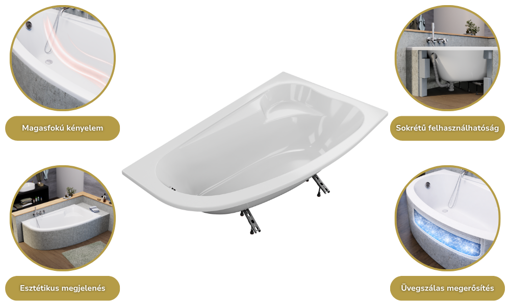 A fürdőkádjaink sokrétű módon felhasználhatóak: burkolható, lábra szerelhető, valamint padlóba süllyeszthető. A fürdőkádhoz tartozó elő és/vagy oldallap könnyedén felhelyezhető.