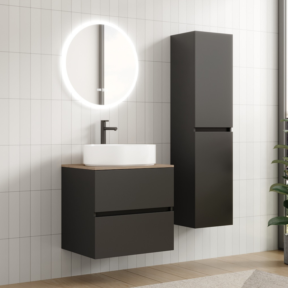 Saját márkás 60 cm széles komplett fürdőszoba bútor fali mosdószekrénnyel antracit színben, tölgyfa színű mosdópulttal és fali okos LED tükörrel.