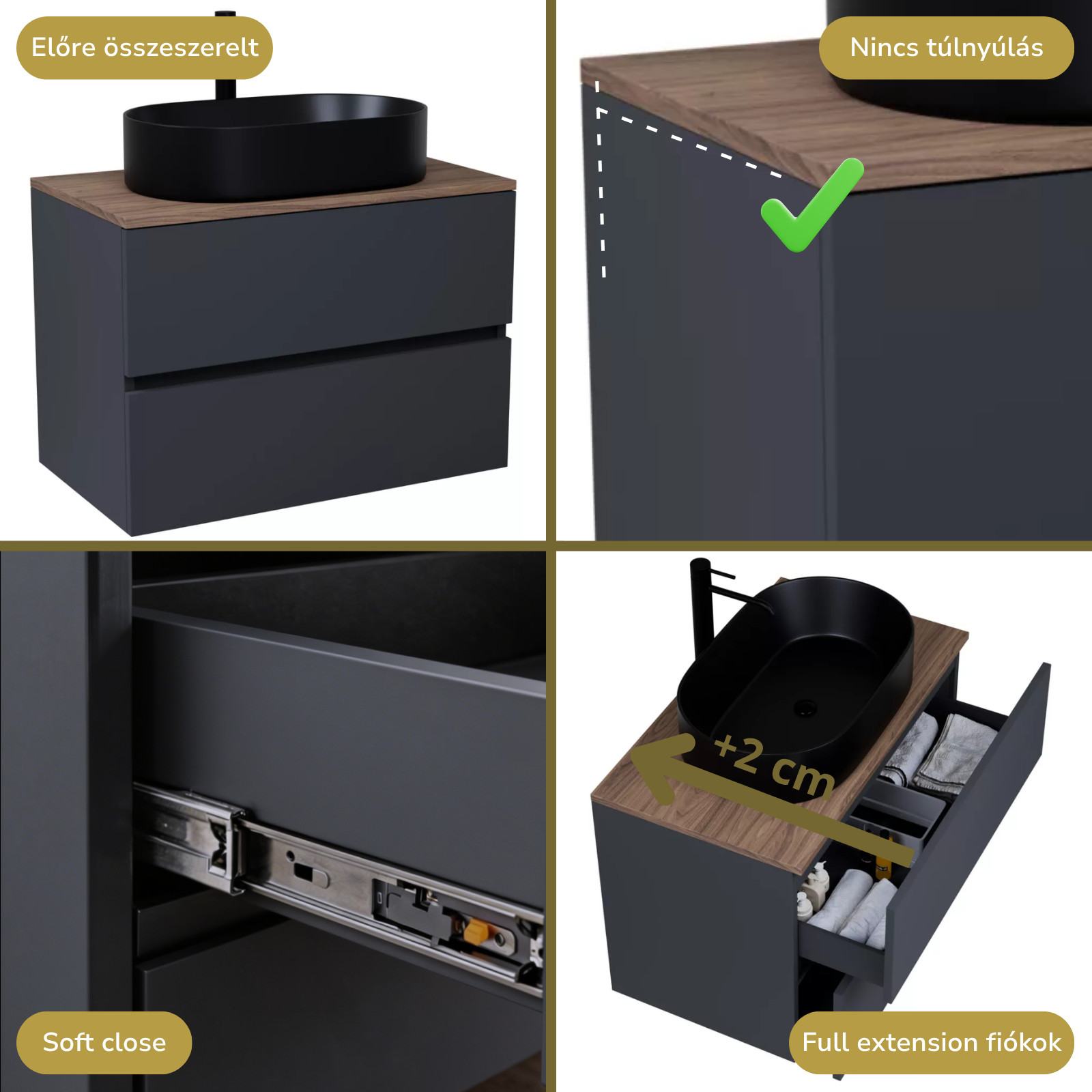 • antracit mosdószekrény, teljes kihúzhatóságú fiókokkal