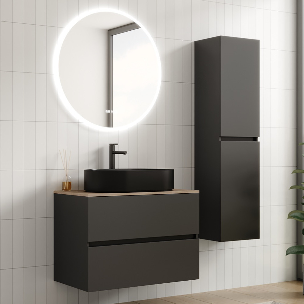 Saját márkás 80 cm széles komplett fürdőszoba bútor fali mosdószekrénnyel antracit színben, tölgyfa színű mosdópulttal és fali okos LED tükörrel.
