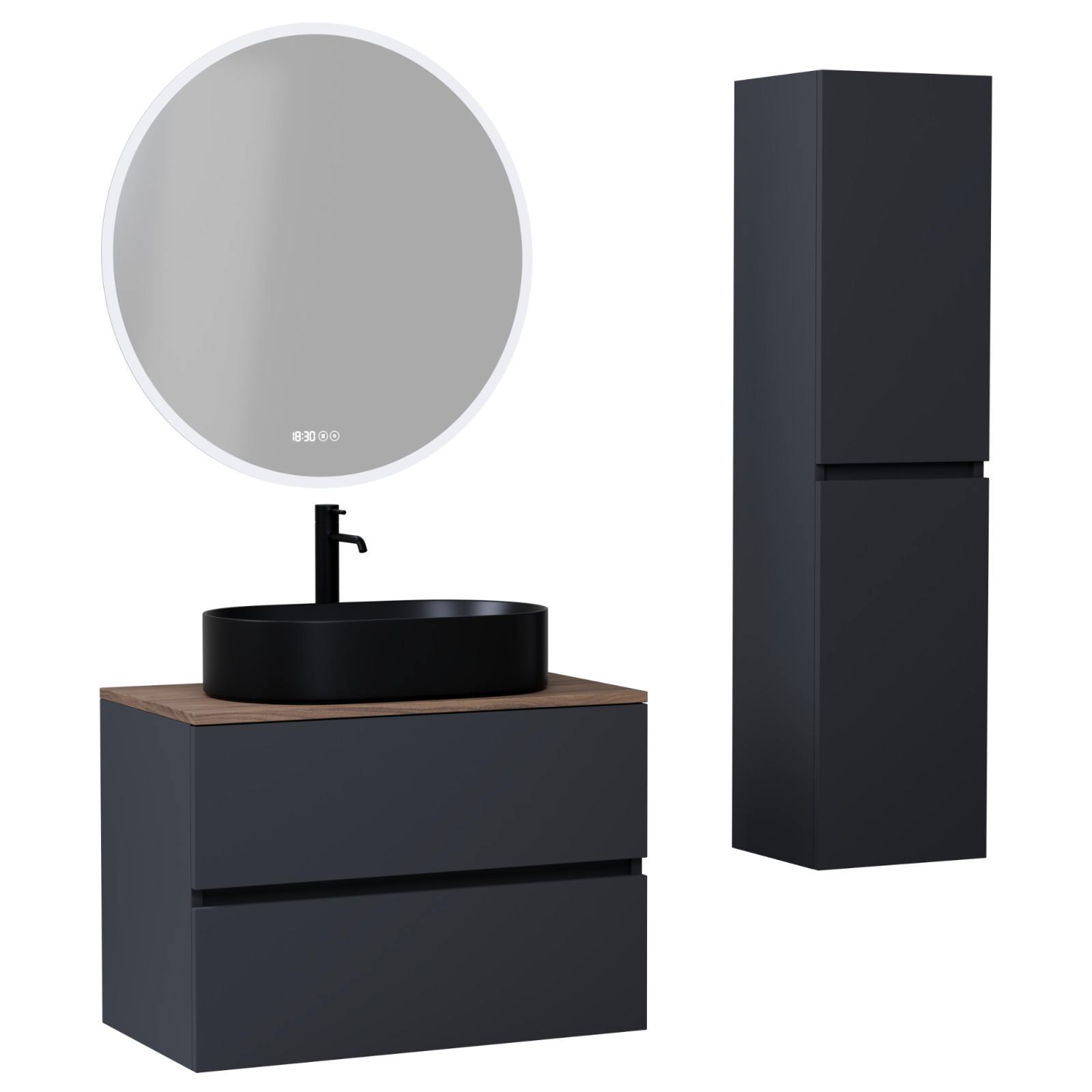 Saját márkás 80 cm széles komplett fürdőszoba bútor fali mosdószekrénnyel antracit színben, tölgyfa színű mosdópulttal, okos LED tükörrel és magasszekrénnyel.