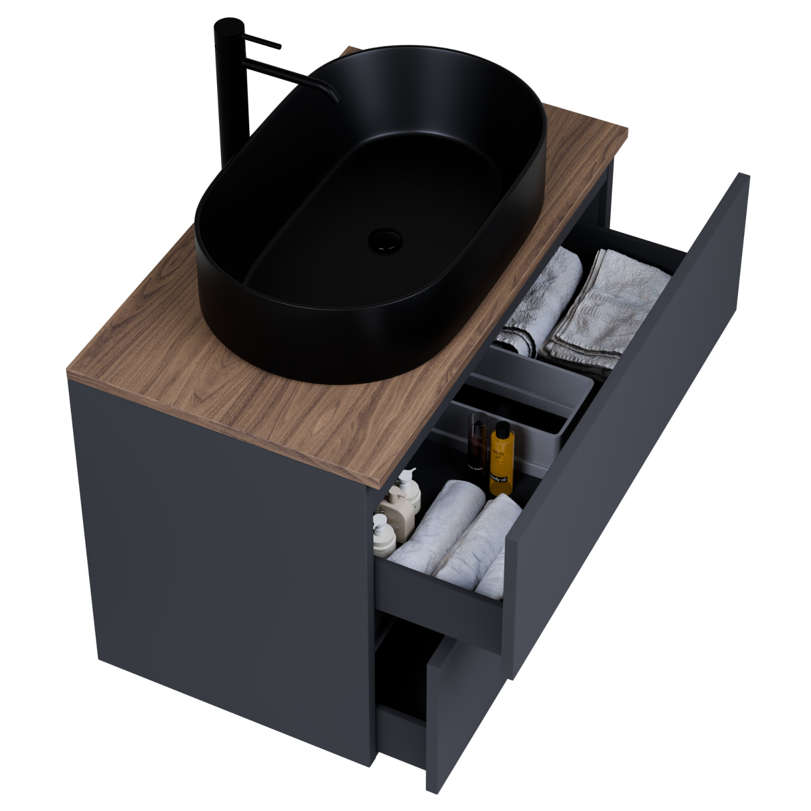 • antracit mosdószekrény, teljes kihúzhatóságú fiókokkal