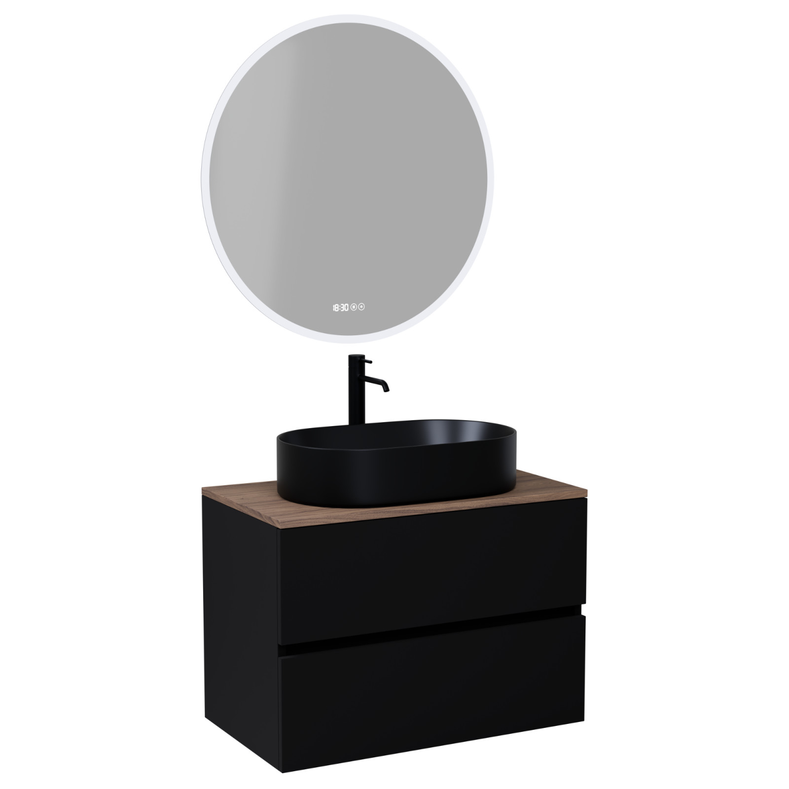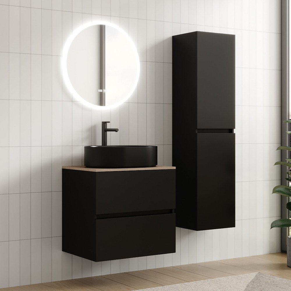 Saját márkás 60 cm széles komplett fürdőszoba bútor fali mosdószekrénnyel fekete színben, tölgyfa színű mosdópulttal és fali okos LED tükörrel.