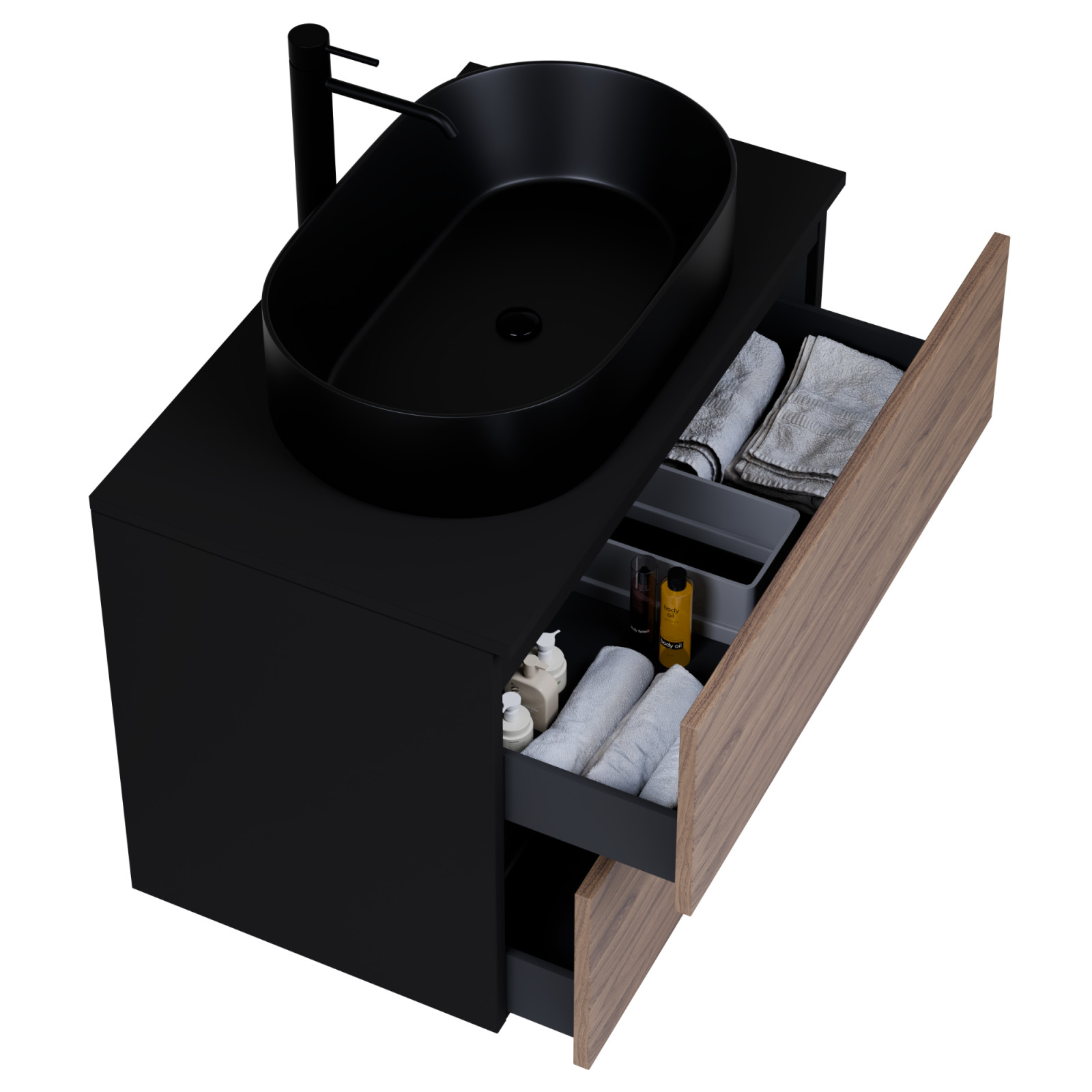 Saját márkás 60 cm széles komplett fürdőszoba bútor fali mosdószekrénnyel fekete színben, tölgyfa színű fiók fronttal, fekete mosdópulttal és fali okos LED tükörrel.